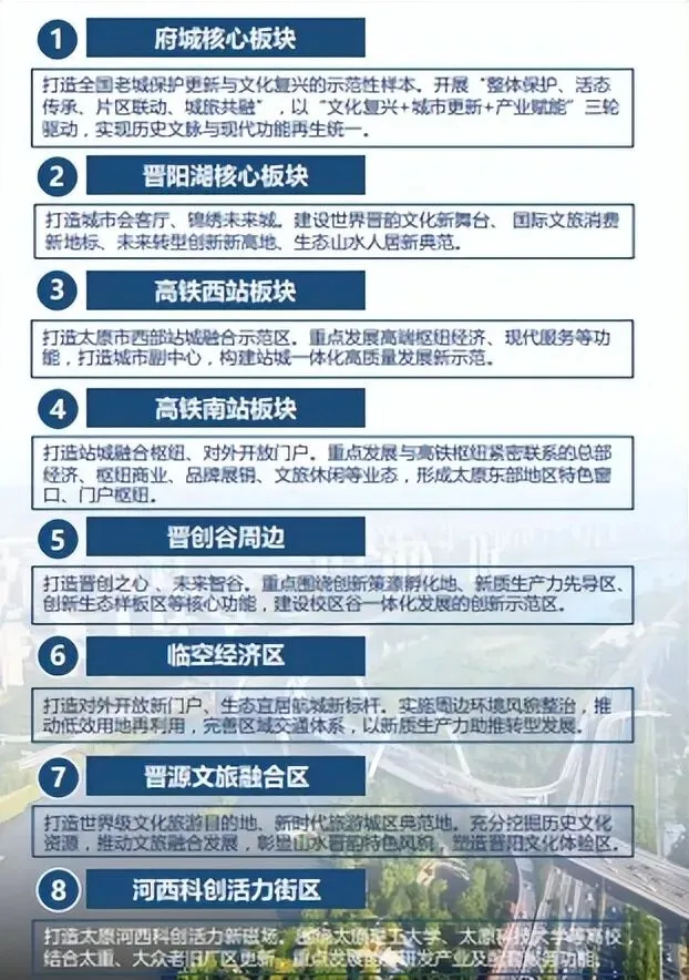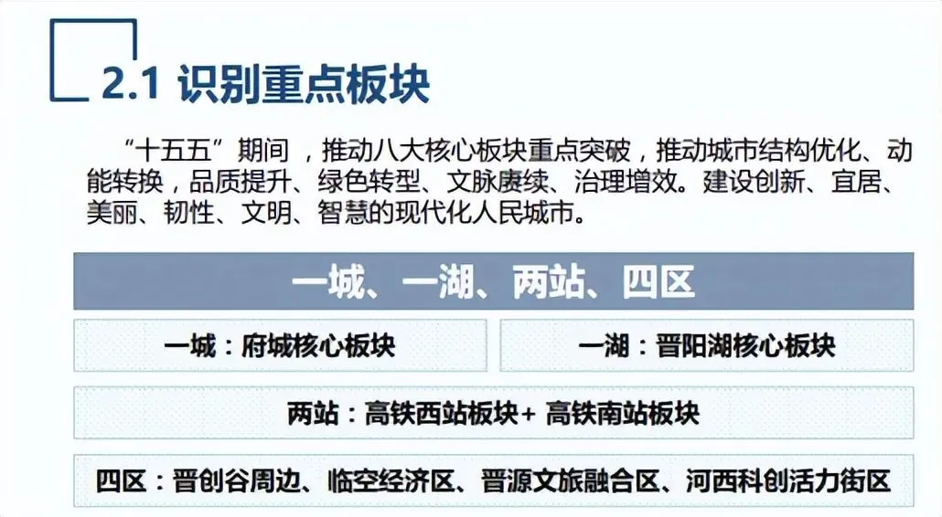 未来5年,太原规划的8大板块,可概括为一城、一湖、两站、四区,让市民耳熟能详朗朗上口,抢占一席之地赢得先机。