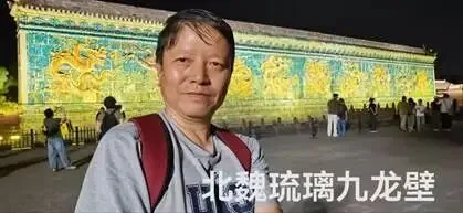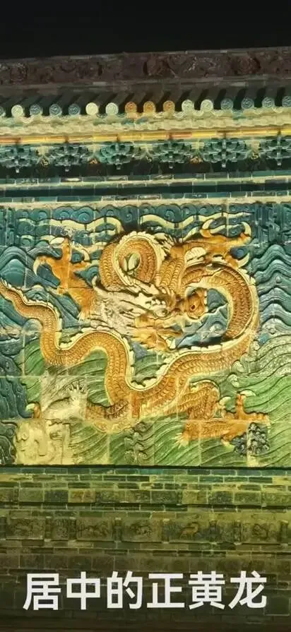 照壁是琉璃瓦制成的,有唐三彩的色釉感,在灯光的照射下流光溢彩、光可鉴人……上天下海中间龙腾熠熠生辉。