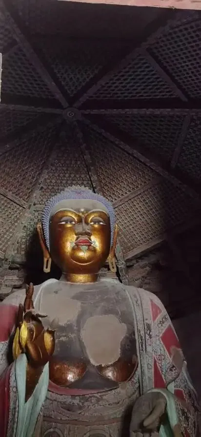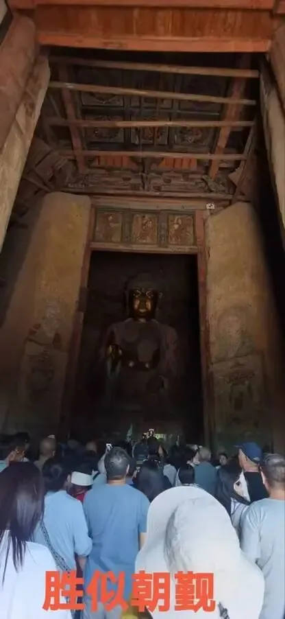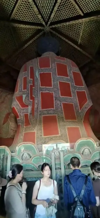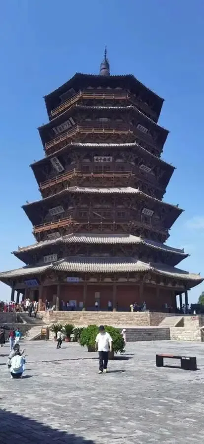 告別懸空寺,我們又坐直通車来到應縣木塔,这是一座上千年的佛教寺廟的木構古塔。據說當年梁思成、林徽因直接讚歎是世界奇觀,而且還爬到高高的塔頂外,測量拍照塔頂上的寶剎什麼的,真是要為民族建筑成就的弘扬而奮不顧身了。外觀塔有六、七層,內觀實有三、四層。塔內有釋迦的巨大雕塑,有壁畫......可惜人多擁擠,光線又暗,看不清楚也看不仔細,只依稀耳旁刮到一句:已經斜了,趕緊來看看吧,以後不一定能看不到喽。我觉得這話說的有種惺惺相惜般的多情和伤感,當然,也有些多慮。這木塔是佛塔,是釋迦塔,佛祖雕塑穩坐塔內供遊人參拜祈福,应该是佛光普照岂千年?木有灵犀不惧斜的,我相信。