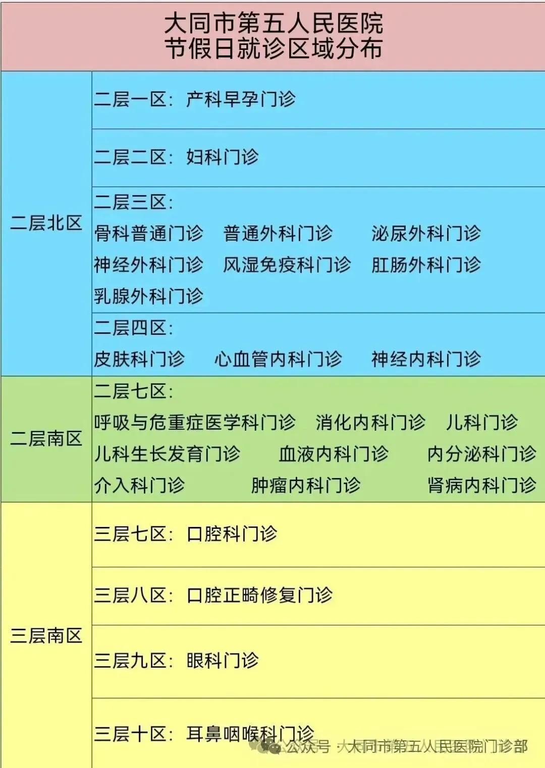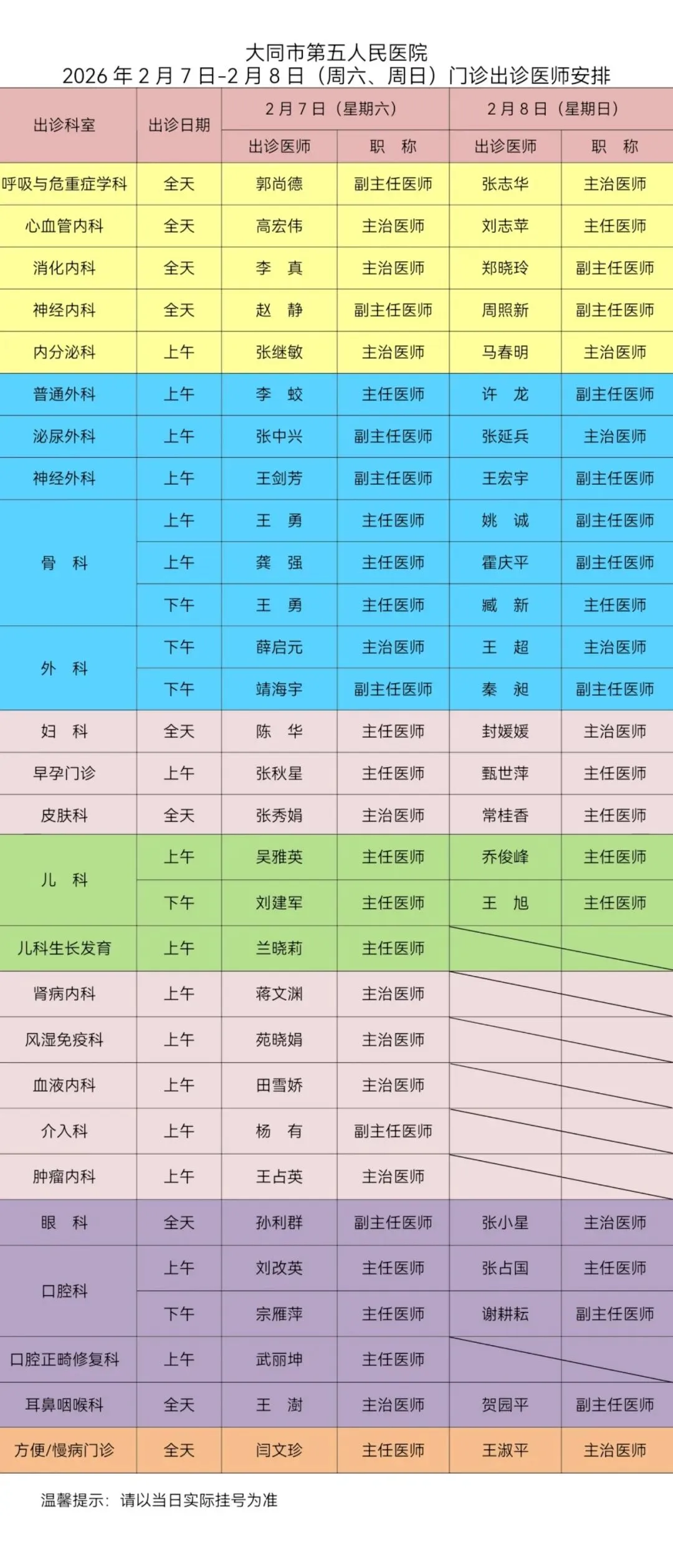 【无休门诊】大同市第五人民医院2026年2月7日、2月8日(周六、周日)无休日门诊出诊医师安排