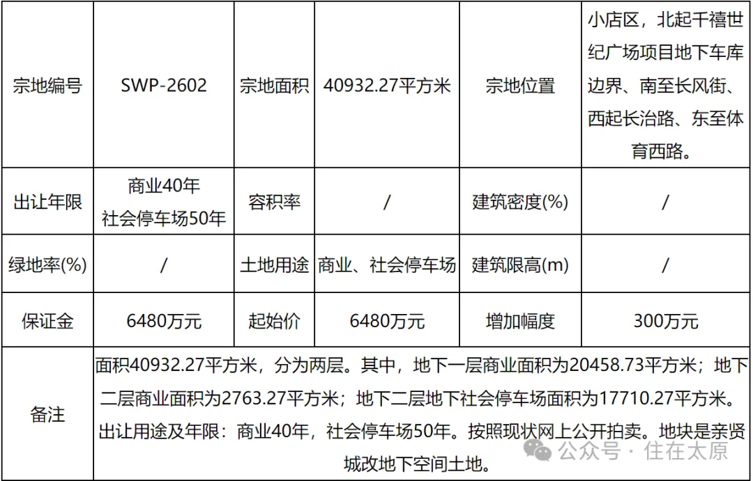 宗地位于小店区,北起千禧世纪广场项目地下车库边界、南至长风街、西起长治路、东至体育西路。土地用途为商业、社会停车场。