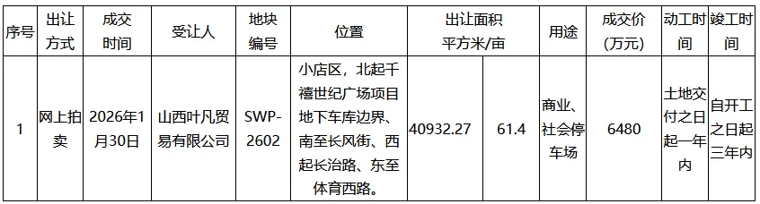 宗地编号SWP-2602,出让面积40932.27平方米(61.40亩),商业分摊面积23222平方米(34.83亩),社会停车场分摊面积17710.27平方米(26.57亩)。