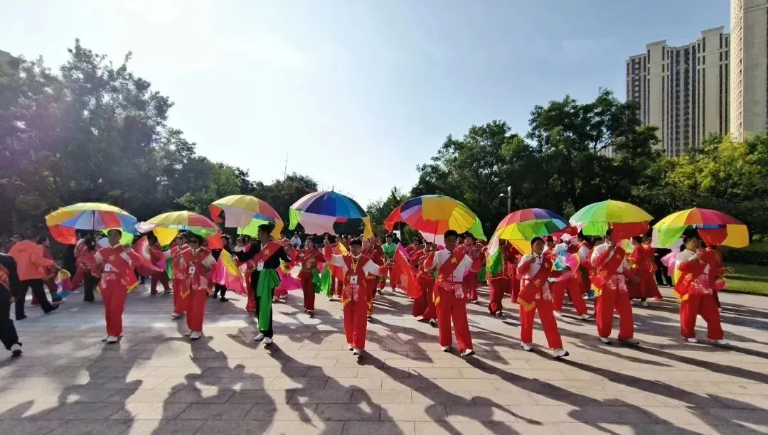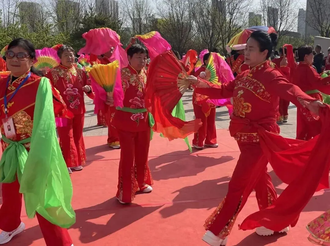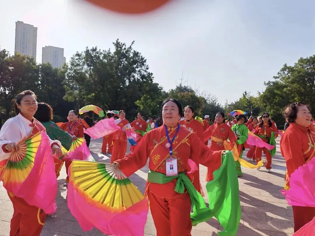 队伍的规模和日常,藏着最让人暖心的坚持。队员主要是中老年人,岁数从40到85岁不等,还一个劲儿吸纳年轻人来凑趣、添活力,形成了老中青三代一块儿耍、手艺往下传的热闹格局。从一开始的十几个人,到如今的四五十人,这些年一步步壮大,平时表演一般都有30到50人;每逢正月新春这些老节日,更是能凑上几百人一起扭,红绸子甩得漫天飞,鼓点敲得震天响,成了龙城街头最能聚人气、最吸眼球的民俗大戏。“每天八点到十点”,是队伍雷打不动的活动时间,老问夫妇天天“往前冲”似的先到场地,扯着嗓子喊上周边爱耍的街坊,音乐、家伙事儿样样都带齐,不管刮风下雨、严寒酷暑,从没断过档、撂过挑子。公园的小道儿、中心广场这些开阔地方,都是他们的排练场,基础动作抠一抠、队形排一排、曲子练一练,天天不闲着、日日有进步。春天淋着小雨扭,伞沿滴的水珠跟着舞步跳,裤脚湿了也乐呵呵;夏天淌着汗耍,彩扇扇出的风驱散暑气,汗珠子滚下来也不耽误;秋天踩着落叶扭,鼓点跟树叶沙沙响凑成曲儿,脚下踩着“沙沙乐”;冬天踏着雪耍,红衣服的身影在寒风里蹦跶,浑身冒热气一点儿不冷。一年到头,这抹扭着跳着的身影,都是和平公园最暖、最热闹的景儿。更有意思的是,秧歌队还建了个工作群,里头足足聚了二百八十多人,天天在群里说学逗唱、谈天说地,东拉西扯唠家常,热闹得跟赶庙会似的!线上线下,一静一动,把老头老太太们哄得天天乐的屁颠屁颠的,腰不酸了腿不疼了,越活越精神、越活越年轻!