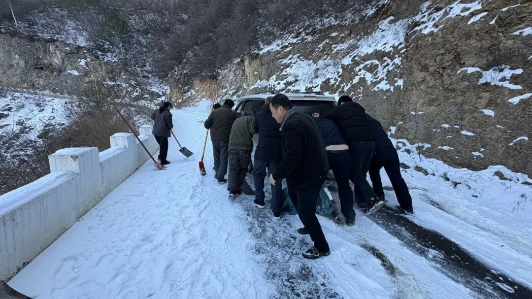 铲车轰鸣,推开主干道积雪;众人挥锹,刨开车轮下冰层。为增加抓地力,派出所紧急调来的防滑链被快速装上车轮。边沟旁的越野车最难处理——民警指挥铲车稳住车身,众人搬来石块垫稳路基,绳拉人推,一次次尝试后,车辆终于被缓缓拉回路面。