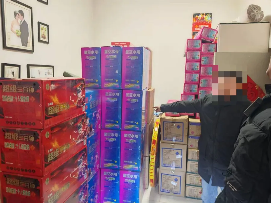 前期,分局民警结合信息研判结果和群众举报线索,经过细致摸排、精准核查,最终锁定长治市上党区某村一处隐蔽院落内,存在非法储存、买卖烟花爆竹的重大嫌疑。在上级公安机关的指导下,潞城分局治安大队迅速制定抓捕方案,果断实施突击检查,成功进入该隐蔽院落,当场查获各类烟花爆竹700余件,涉案金额逾10万元,抓获违法嫌疑人张某、常某。