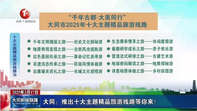 “千年古都·大美同行”。日前,大同市2025年十大主题精品旅游线路“出炉”,从“世界遗产巡礼+古建艺术解码”,从自然风光揽胜到非遗休闲体验,从边塞风光到乡村漫游等,大同市诸多名胜古迹和特色景点全部囊括其中,期待你的到来。