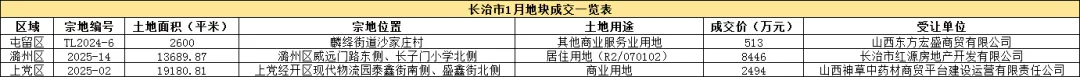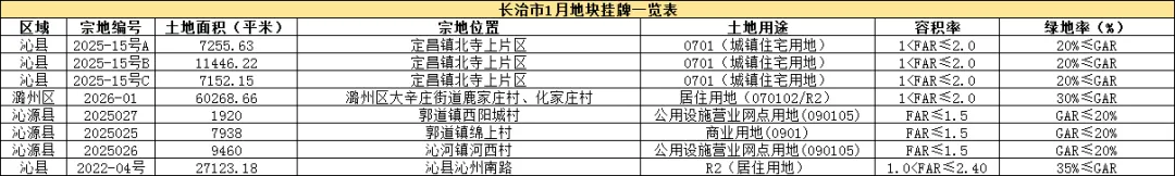 1月长治土地挂牌共8宗。挂牌总面积132563.84平米。潞州区1宗,为居住用地;沁县4宗,均为城镇住宅用地;沁源县3宗,为公用设施营业网点用地及商业用地。