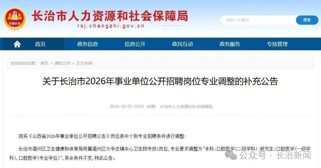 长治市潞州区卫生健康和体育局所属潞州区大辛庄镇中心卫生院专技1岗位,专业要求调整为"本科:口腔医学(二级学科);研究生:口腔医学(一级学科),口腔医学(专业学位)",其余条件不变,特此公告。