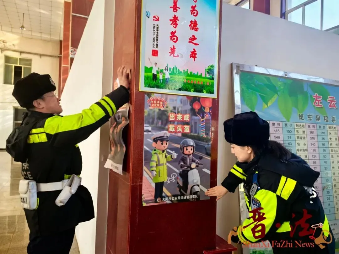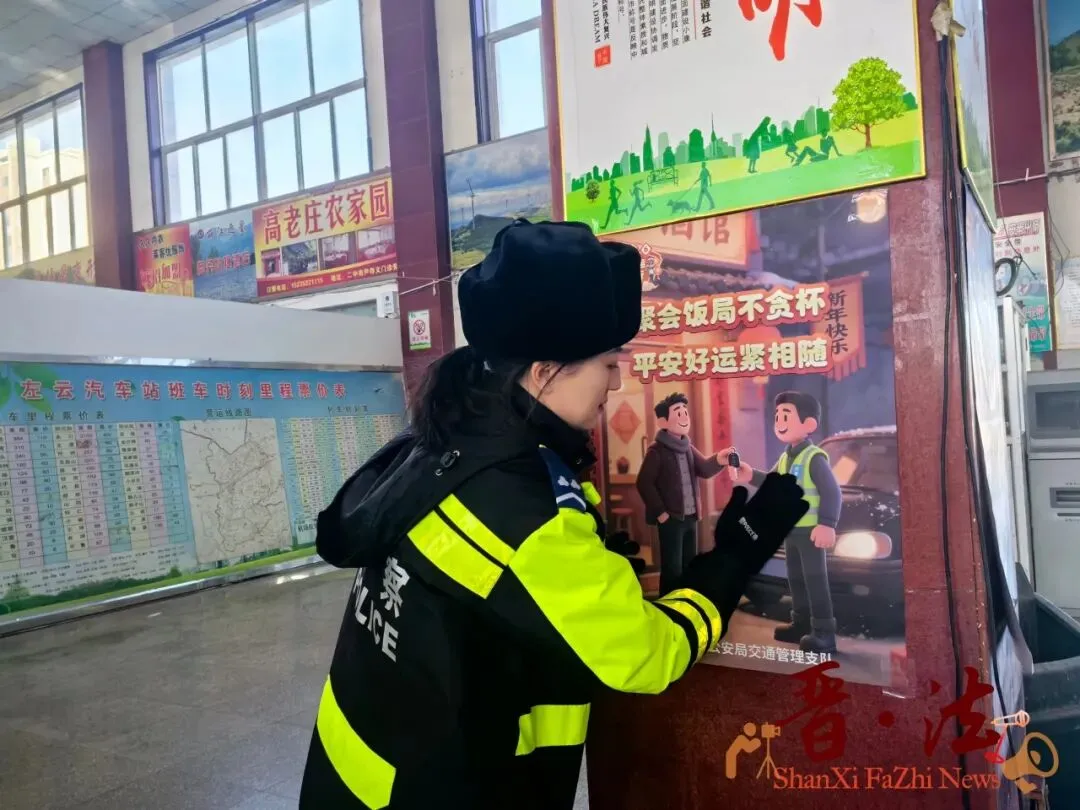 民警在汽车站大厅、候车区、出站口等醒目位置,张贴数十张春运交通安全宣传海报,悬挂春运主题条幅,直观传递交通安全理念。同时,各单位工作人员向过往旅客、驾驶员发放宣传手册,耐心讲解春运出行注意事项、应急避险技巧及相关法律法规,引导群众自觉遵守交通规则,增强安全防护意识。