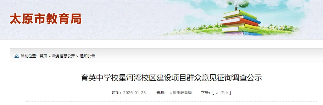 1月23日,太原市城市建设管理中心《育英中学校星河湾校区建设项目群众意见征询调查公示》(成文日期1月19日)公开发布;根据项目建设相关文件要求,本项目建设情况公告如下——