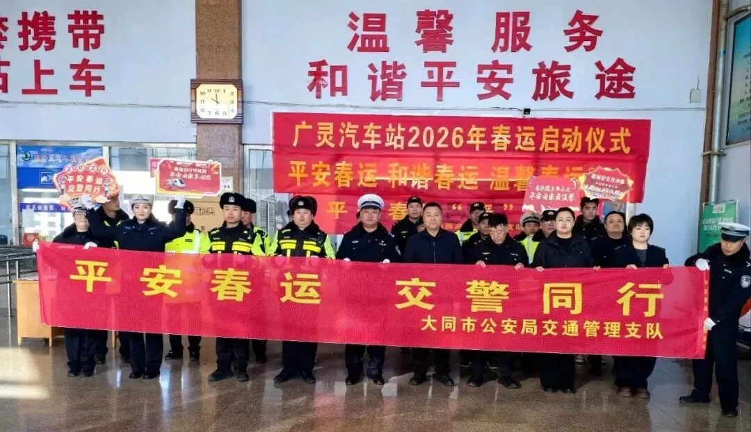 岁末护平安,春运启新程。为切实筑牢2026年春运期间辖区道路交通安全防线,有效预防和减少道路交通事故,全力营造安全、文明、和谐的出行环境,2月2日上午,广灵县公安局交通管理大队联合交通运输局、高速支队等部门开展“平安春运·交警同行”为主题的春运启动仪式,并同步开展交通安全主题宣传活动。 启动仪式上,广灵公安交管大队与交通运输局负责人对春运安全工作进行了部署。强调春运期间人流、车流激增,道路交通安全形势严峻,交通运输部门、重点运输企业要做好应对措施,确保畅通高效,为人民群众平安返乡、欢度春节、安全回程创造平安、畅通、温馨的交通环境。要求全体交通参与者牢固树立“安全第一”理念,共同筑牢春运安全屏障,并宣布2026年春运工作正式开始。