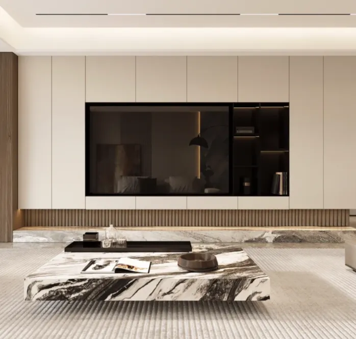 地面选用意大利灰大理石或卡拉卡塔金大理石,采用1.2m×1.8m大尺寸柔光砖,以0.5mm密封连纹铺贴工艺,减少缝隙感,呈现天然石材的细腻纹理与温润光泽,同时做防滑处理,兼顾美学与实用性;客餐厅局部搭配烟熏橡木或胡桃木实木地板,温润的木质肌理中和石材的冷感,增添空间暖意,适配北方冬季的居住体验。
