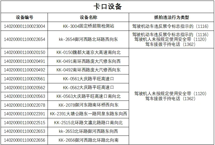 为了进一步规范我市道路交通秩序,有效遏制道路交通事故的发生,减少道路交通违法行为,净化道路交通环境,根据《中华人民共和国道路交通安全法》及其实施条例以及公安部《道路交通安全违法行为处理程序规定》要求,大同市公安局交通管理支队决定启用以下1处超限超载检查站点货运车辆不进站违法抓拍电子设备以及12处抓拍驾驶机动车违反禁令标志指示的、驾驶机人未按规定使用安全带、驾车接拨手持电话的违法抓拍电子设备。