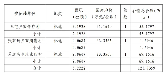 三屯乡南辛庄村:林地2.1928公顷。张家场乡南周窑村:林地0.0687公顷。马道头乡庄家店村:林地2.9607公顷。