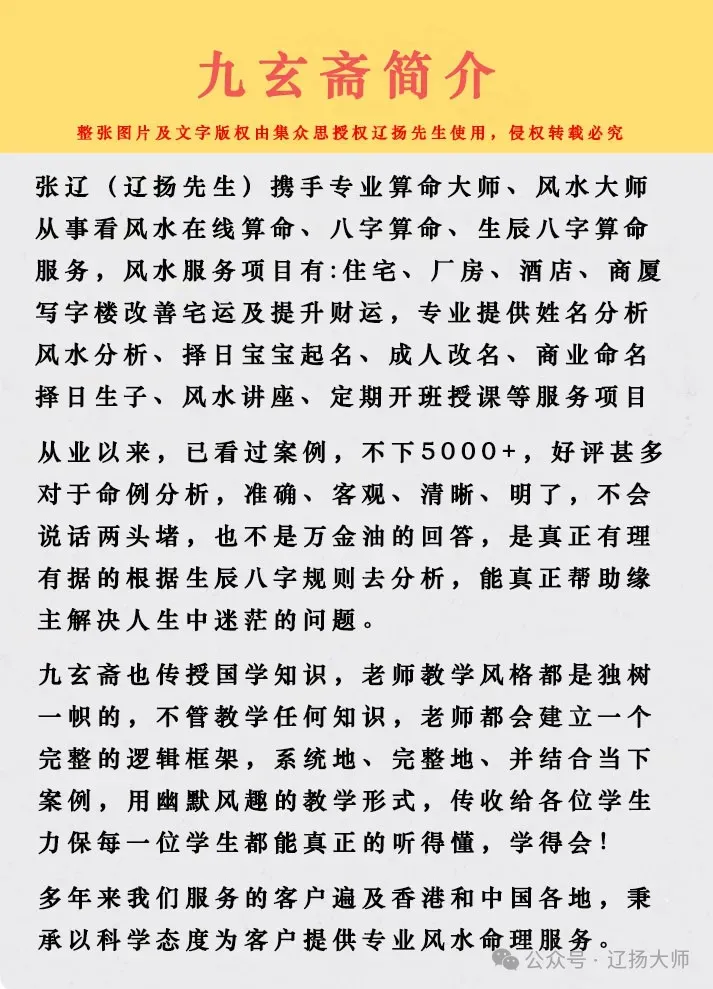 张辽(辽扬先生)专业从事看风水在线算命、八字算命、生辰八字算命服务,风水服务项目有:住宅、厂房、酒店、商厦、写字楼改善宅运及提升财运,专业提供姓名分析、风水分析、择日宝宝起名、成人改名、商业命名、择日生子、风水讲座、定期开班授课等服务项目。
