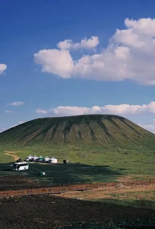 最特别的,是那一串串散落在草原上的火山。不是那种喷着火舌的暴躁,而是沉睡万年的静谧。站在3号火山的边缘往下看,黑色的火山石铺满山坡,像大地的伤口,也像凝固的眼泪。宇航员造型的游客偶尔走过,恍惚间真以为到了异星。