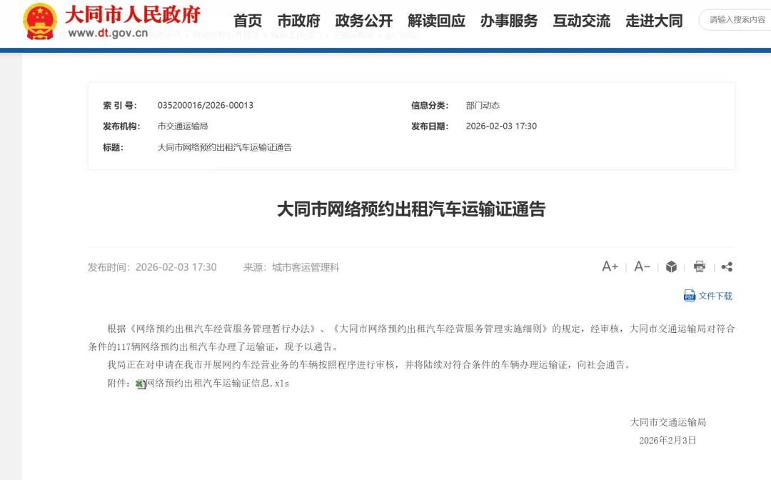 根据《网络预约出租汽车经营服务管理暂行办法》、《大同市网络预约出租汽车经营服务管理实施细则》的规定,经审核,大同市交通运输局对符合条件的117辆网络预约出租汽车办理了运输证,现予以通告。