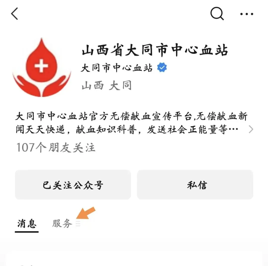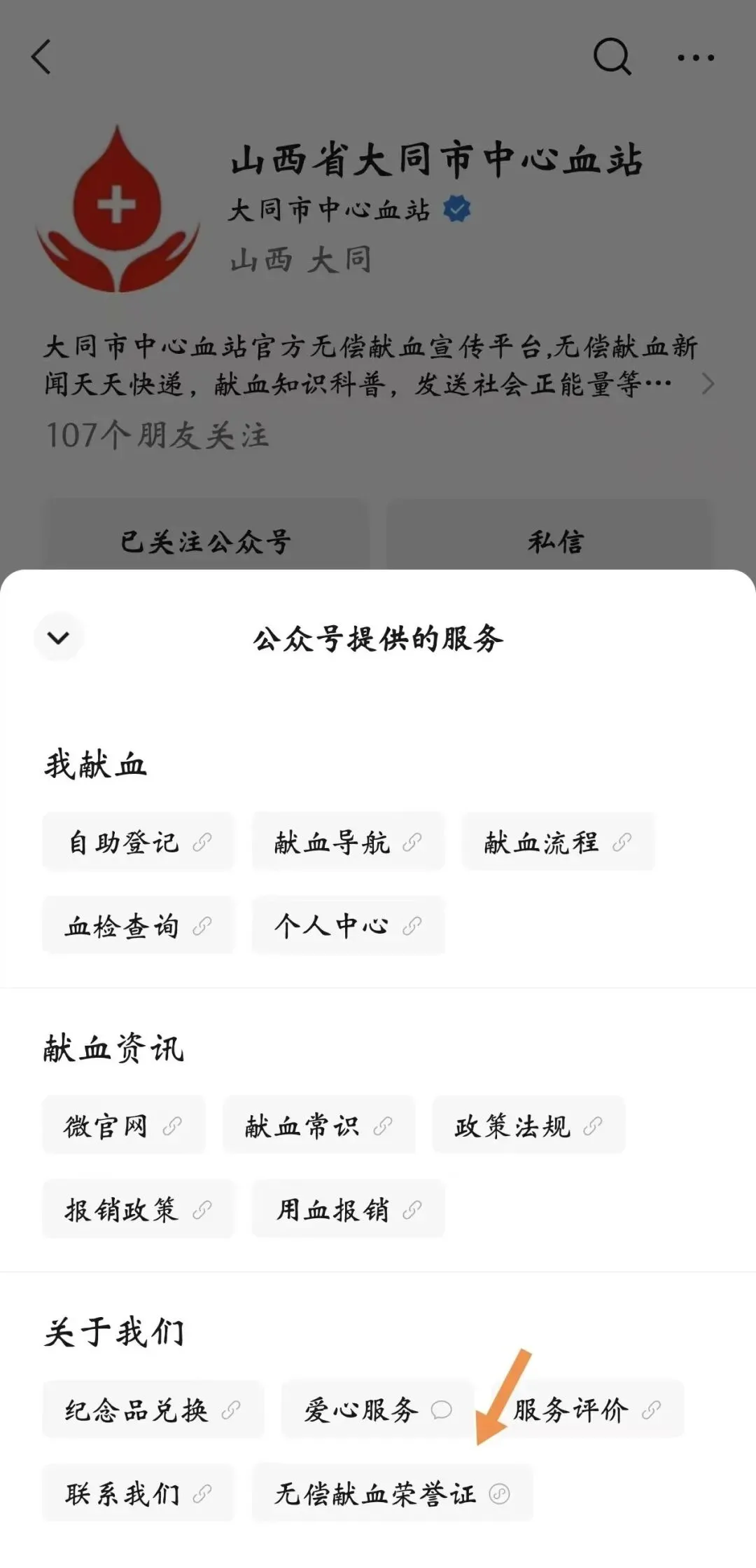 进入公众号首页,点击【服务】【关于我们】进入【无偿献血荣誉证】。