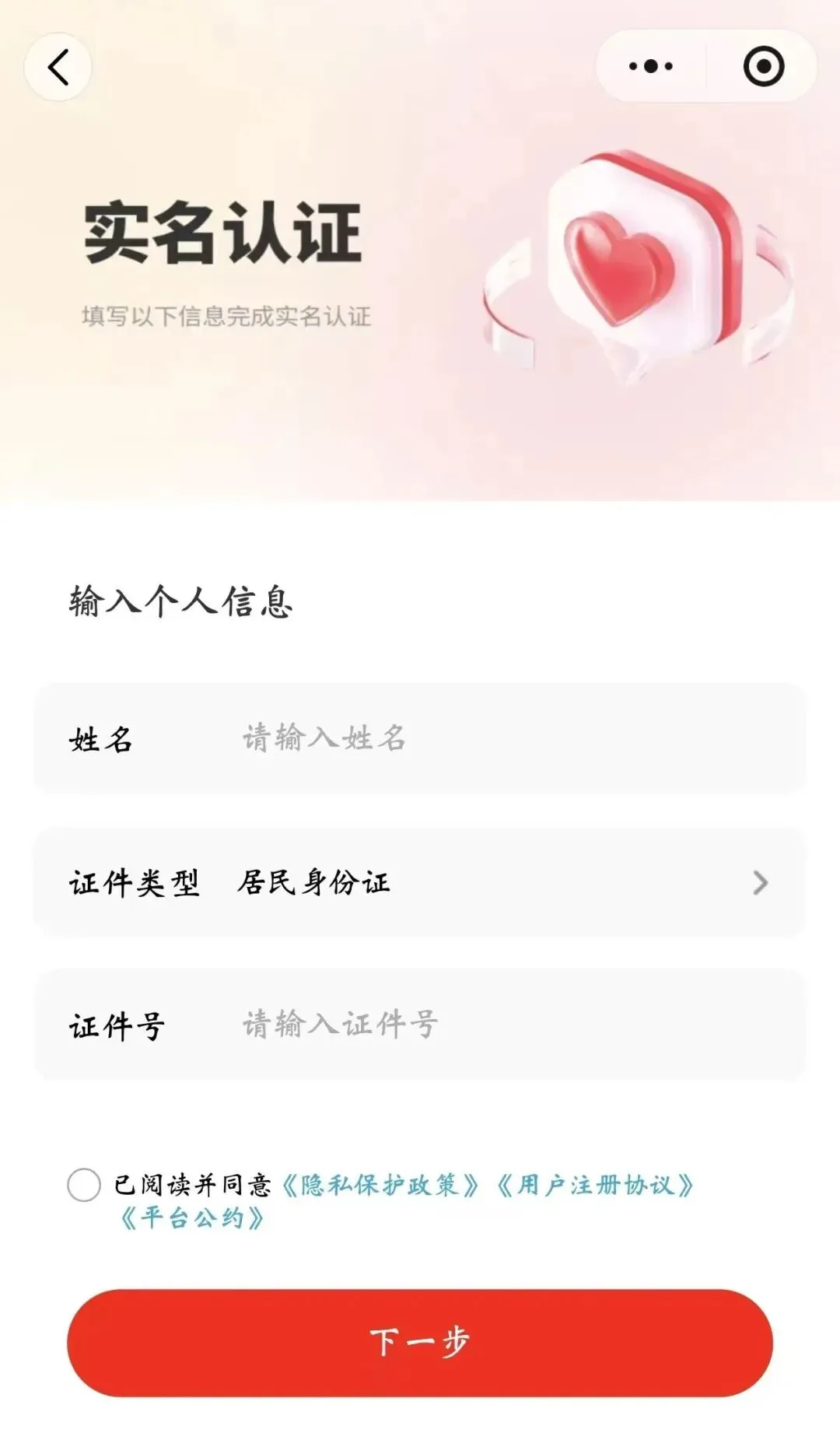 【实名认证】输入姓名、身份证号、手机号码