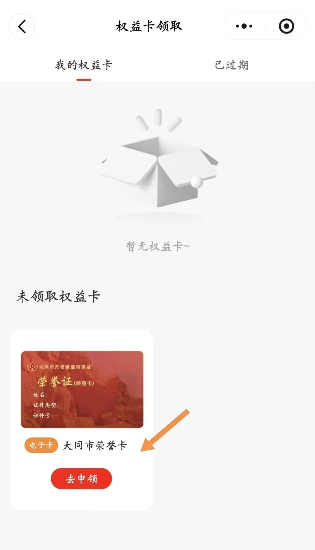 权益卡说明:荣誉卡领取须知请大家仔细阅读,然后点击 【去申领】