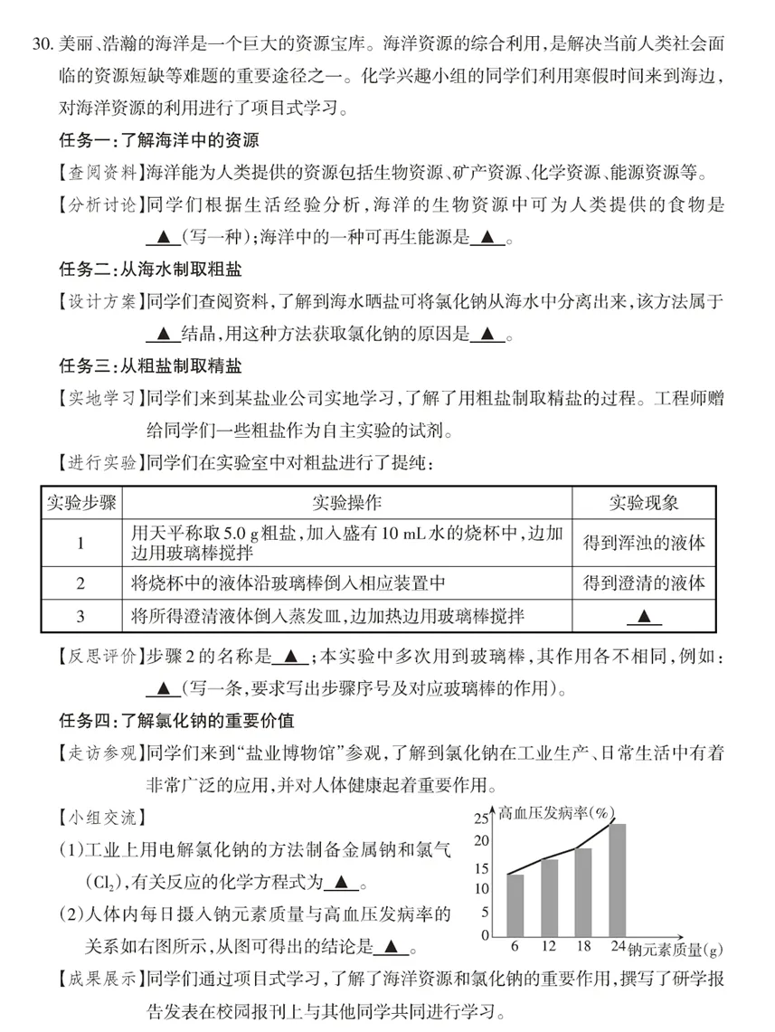 《义务教育课程方案(2022年版)》明确指出,“原则上,各门课程用不少于10%的课时设计跨学科主题学习”。本题以课标中跨学科实践活动—海洋资源的综合利用与制盐为主题,综合体现“物质的性质与应用”、“物质的化学变化”学习主题的大概念及核心知识,承载学生必做实验“粗盐中难溶性杂质的去除”,涉及“化学与社会·跨学科实践”学习主题中“化学与资源、能源、材料、环境、健康”和“化学、技术、工程融合解决跨学科问题的思路与方法”的相关内容。