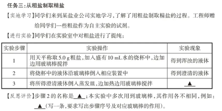 【进行实验】的典型错误有得到精盐/有氯化钠晶体析出/得到澄清的固体等,原因是①不清楚实验现象可以从物质的形态变化、外观变化、能量变化等角度描述。②混淆实验现象和实验结论的表述,在描述现象时出现了物质的名称。