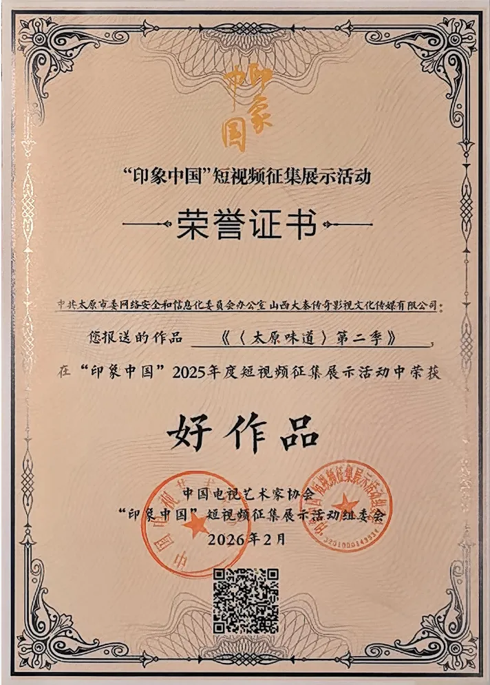 此次获奖并非《太原味道》系列首次收获殊荣。此前,《太原味道》便凭借优秀品质斩获第三十届中国纪录片学术盛典微纪录片类“好作品”奖、第七届山西省社会主义核心价值观主题微电影征集展示活动微电影类一等奖等多项荣誉,还被翻译成西班牙语在中央广播电视总台西班牙语频道全球播出,成功入围第四届美丽乡村国际影像节、第十五届北京国际网络电影展等重要平台,展现了强劲的传播力和影响力。此次再获佳绩,既是对主创团队辛勤付出的高度肯定,也是太原文化旅游品牌影响力持续提升的生动体现,更是“印象中国”活动对太原城市发展与文化传承成果的认可。(申波)