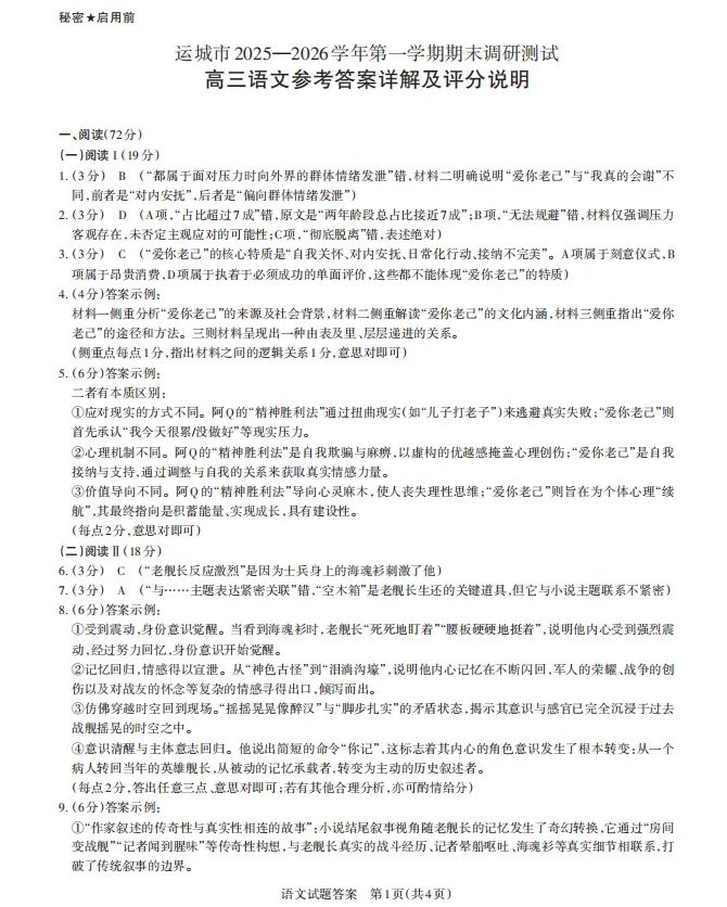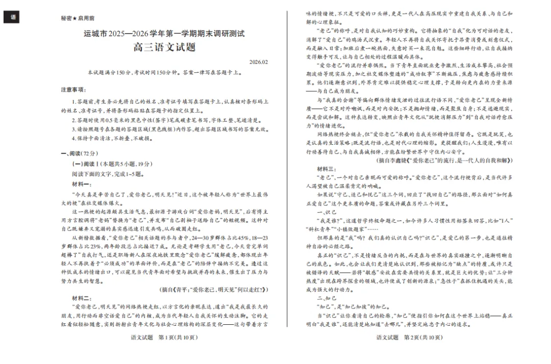 山西思而行·运城、大同、阳泉2025-2026学年高三第一学期期末调研测试全科试卷含答案