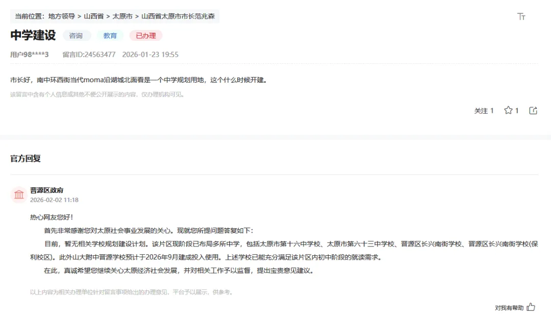 晋源区政府官方回复中明确表示,目前该地块暂无相关的学校规划建设计划。答复中指出,该片区现阶段已布局多所中学,包括太原市第十六中学校、太原市第六十三中学校、晋源区长兴南街学校及其保利校区,同时山大附中晋源学校也预计于2026年9月建成投入使用。这些学校将共同满足该片区初中阶段的就读需求,从而缓解教育资源紧张的问题。