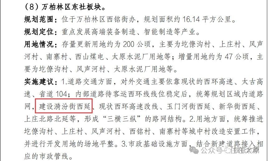 官方回复称:关于漪汾街西延工程道路建设事宜,经了解,万柏林区漪汾街西延工程拟列入我市“十五五城建计划”,现相关部门正在进行方案研究等前期工作。待条件具备后,将适时启动道路建设程序。