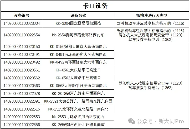 为了进一步规范我市道路交通秩序,有效遏制道路交通事故的发生,减少道路交通违法行为,净化道路交通环境,根据《中华人民共和国道路交通安全法》及其实施条例以及公安部《道路交通安全违法行为处理程序规定》要求,大同市公安局交通管理支队决定启用以下1处超限超载检查站点货运车辆不进站违法抓拍电子设备以及12处抓拍驾驶机动车违反禁令标志指示的、驾驶机人未按规定使用安全带、驾车接拨手持电话的违法抓拍电子设备。