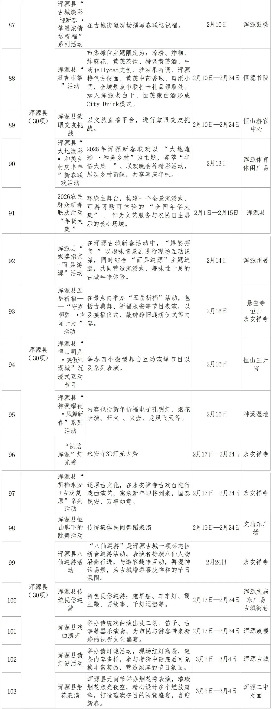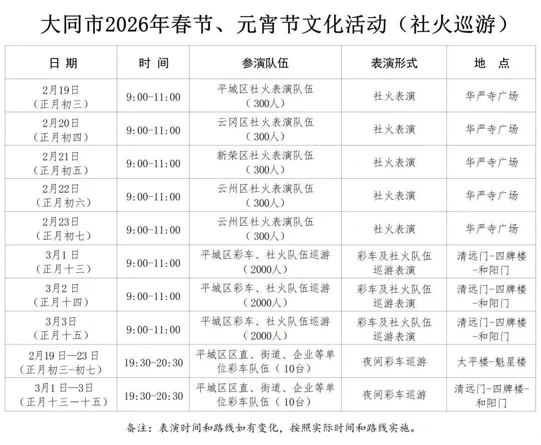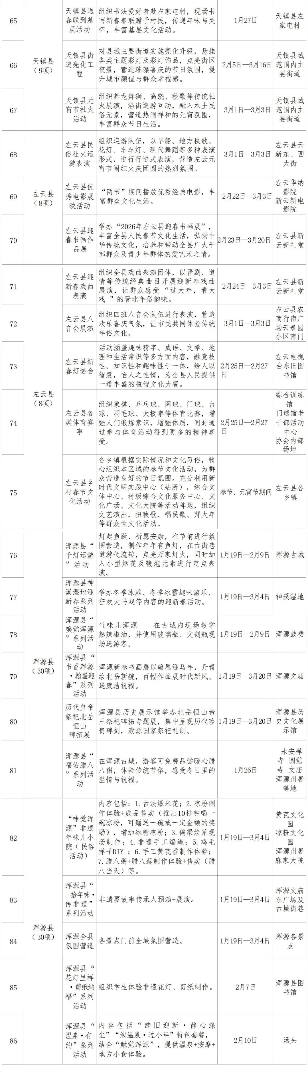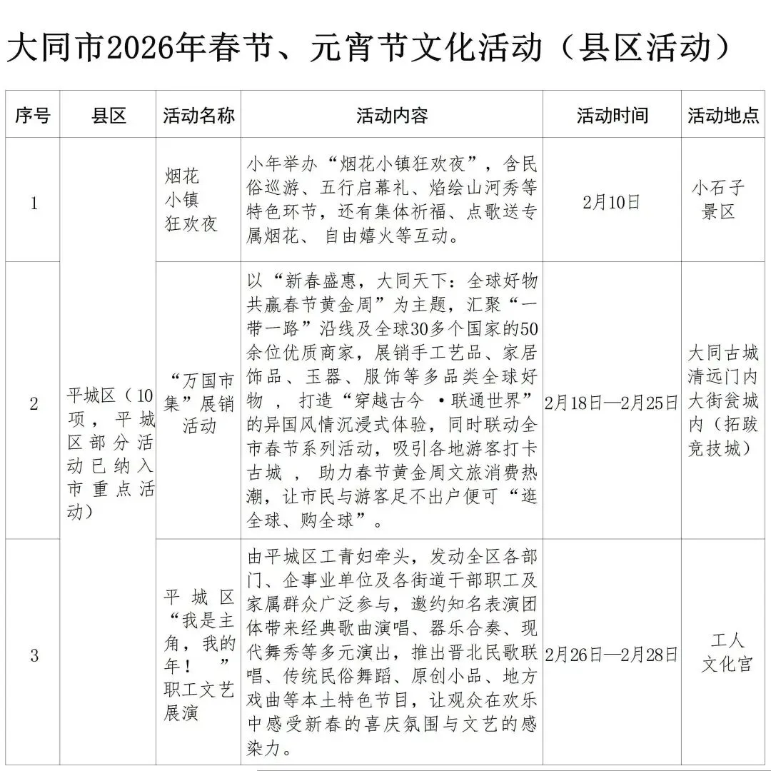 活动内容:开展大同市2026丙午马年新春文化特展、“同享非遗·丙午年韵”2026年新春非遗消费活动;开展国风手工创作、马年创意画、春节剪纸专场、新春手工DIY、肌理画创作、传统手工制作、元宵猜灯谜等系列活动。