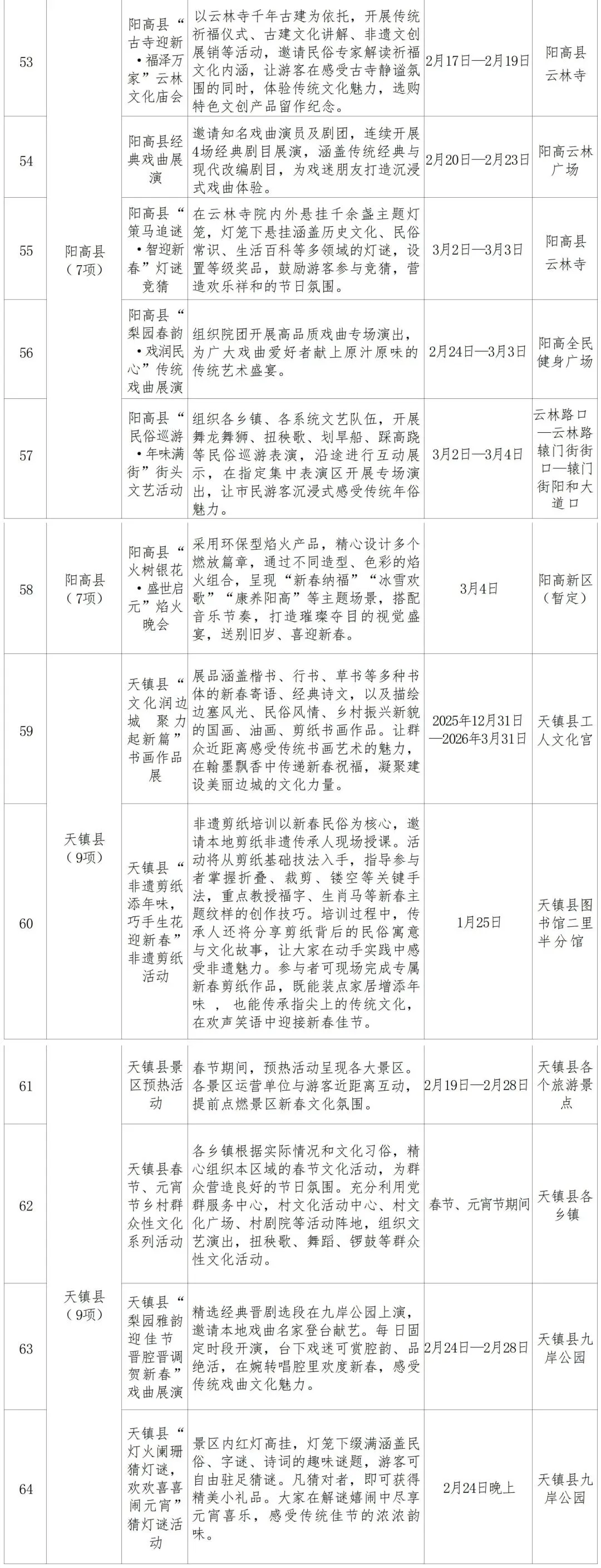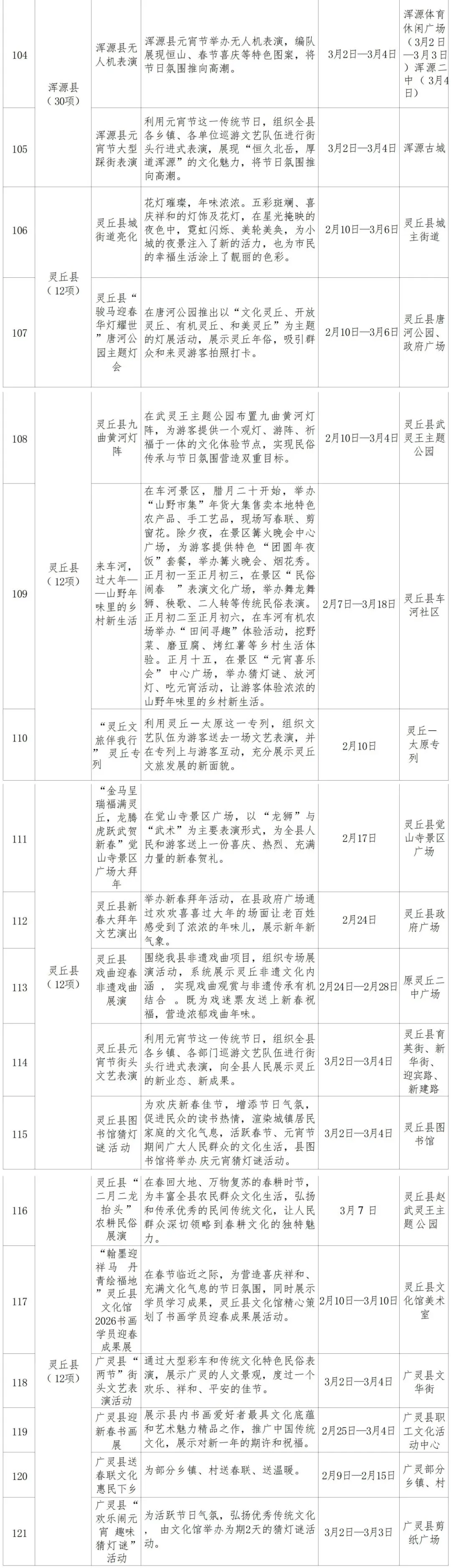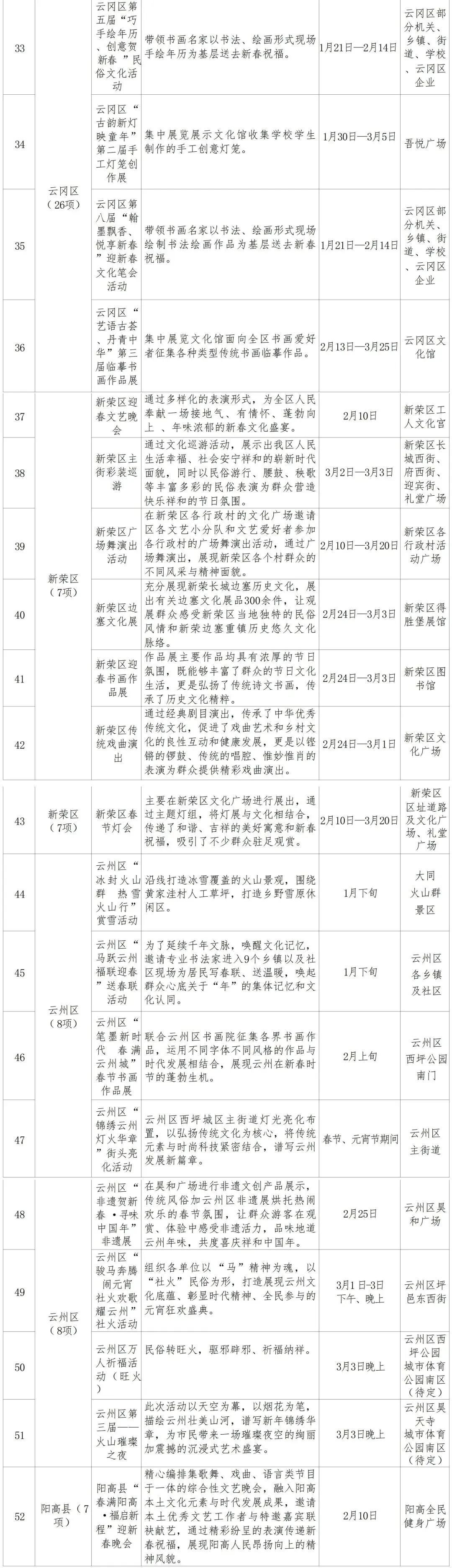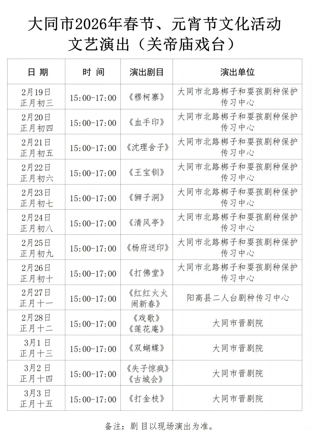 活动内容:以“过年有戏”为主题,组织我市专业文艺院团集中展示晋剧、北路梆子、耍孩儿、阳高二人台等地方戏曲剧种,让戏迷们在正月里过足戏瘾。