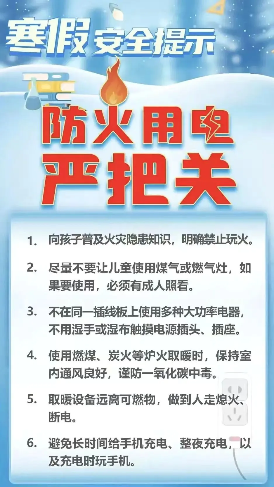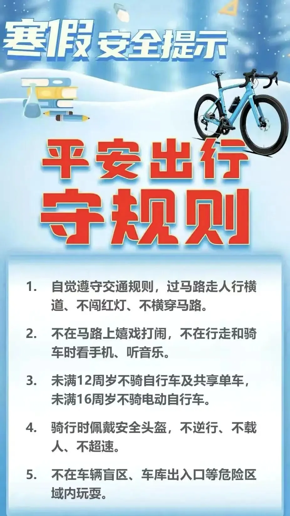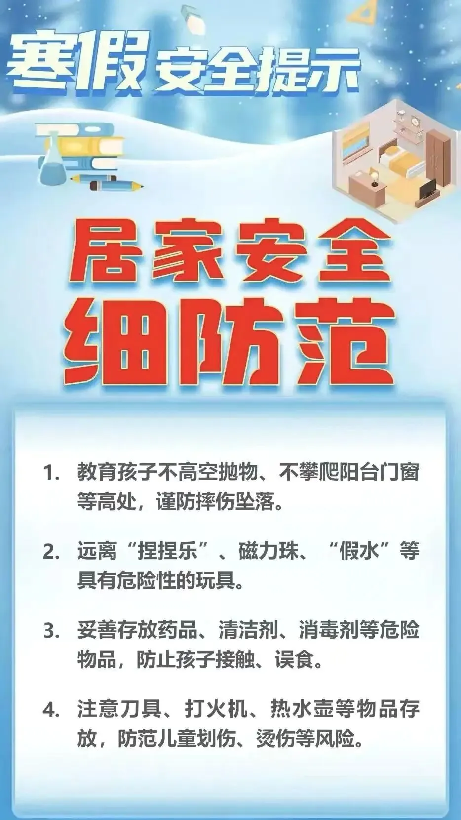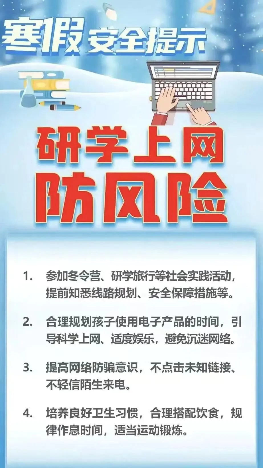 2026年寒假即将到来,为确保孩子们度过一个安全、快乐而有意义的假期,希望家长朋友们能切实承担起监护职责,加强对孩子假期生活的关心与指导,现将寒假安全注意事项温馨提示如下: