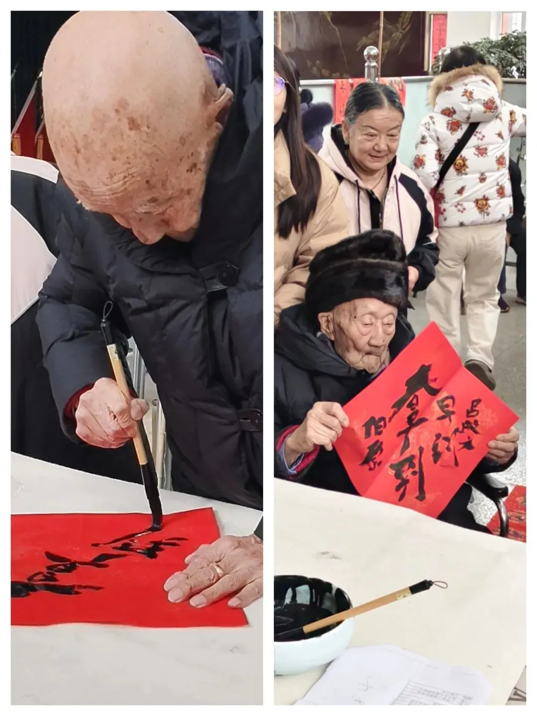 活动现场,书法家们挥毫泼墨,为老同志们书写吉祥春联。尤为动人的是,九十多岁的抗战老兵欣然提笔,亲手写下“春早到”几个大字,其从容气度与赤诚情怀,引来现场阵阵掌声。