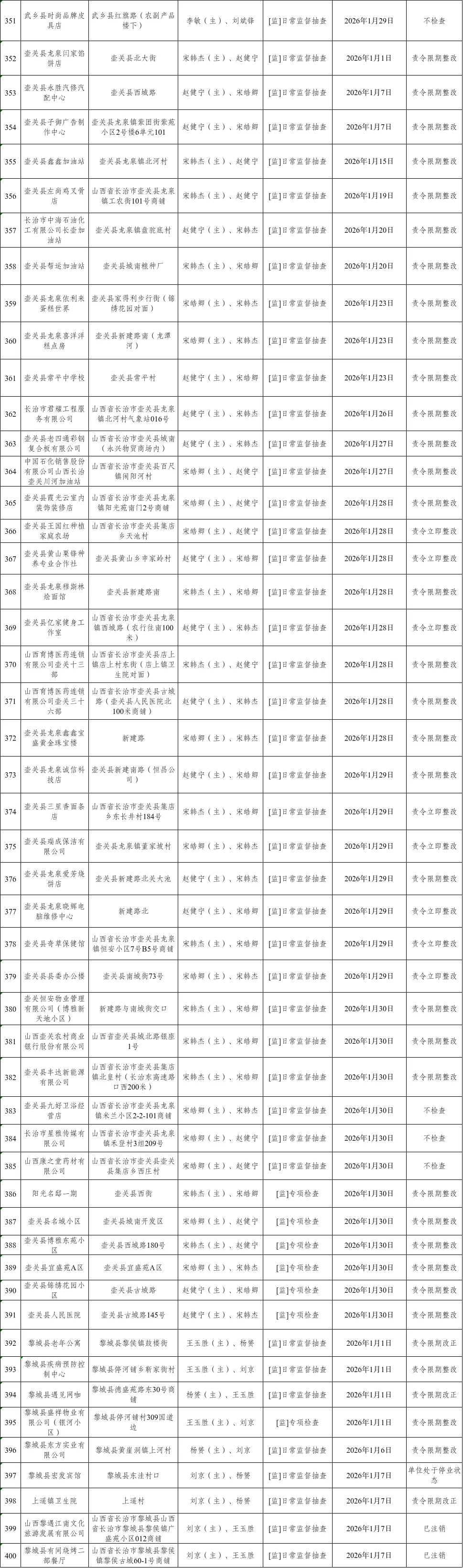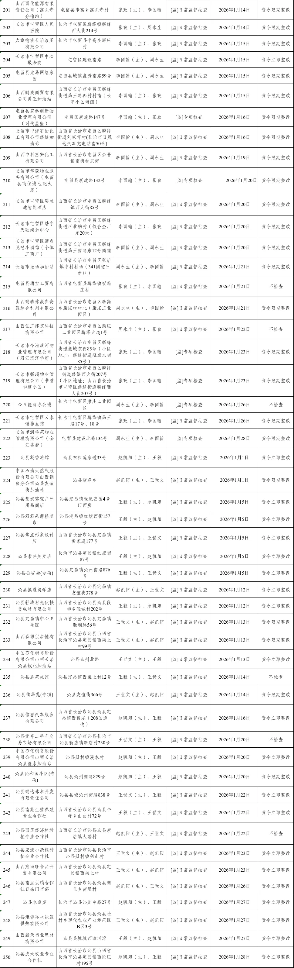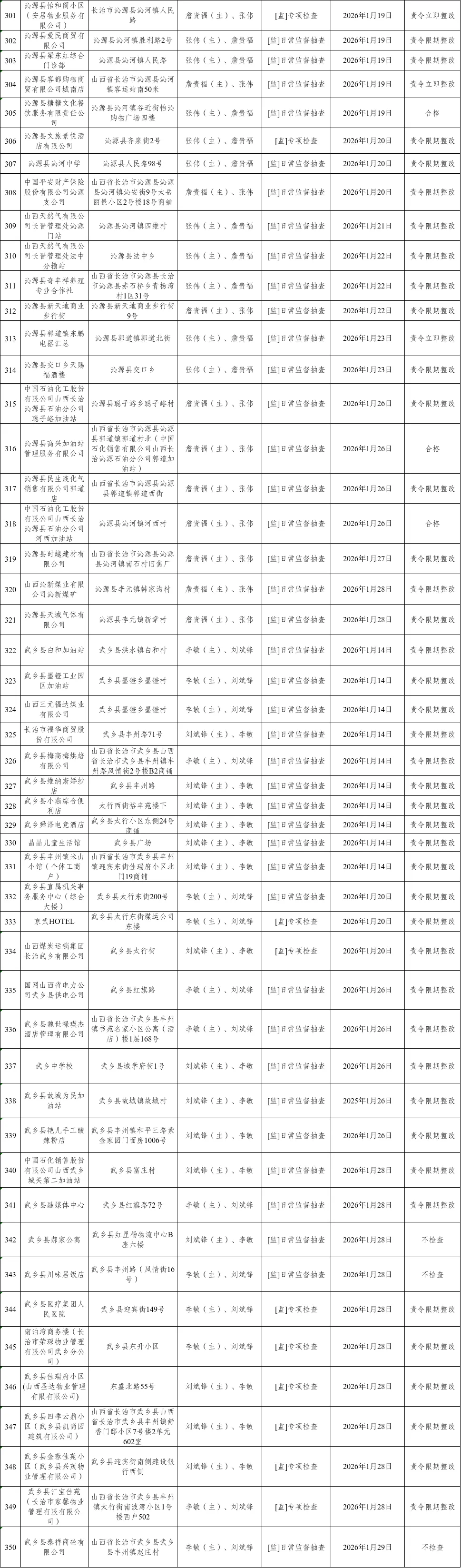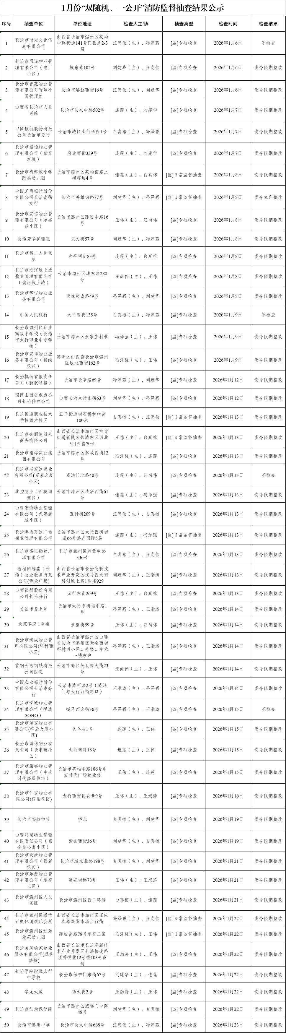 为确保火灾形势持续平稳,全面推行“双随机、一公开”消防监督管理模式。长治市消防救援支队根据年度抽查计划和进度,在2026年1月份对全市消防安全重点单位和非消防安全重点单位进行了监督抽查,现将1月份“双随机、一公开”消防监督抽查结果公示如下:
