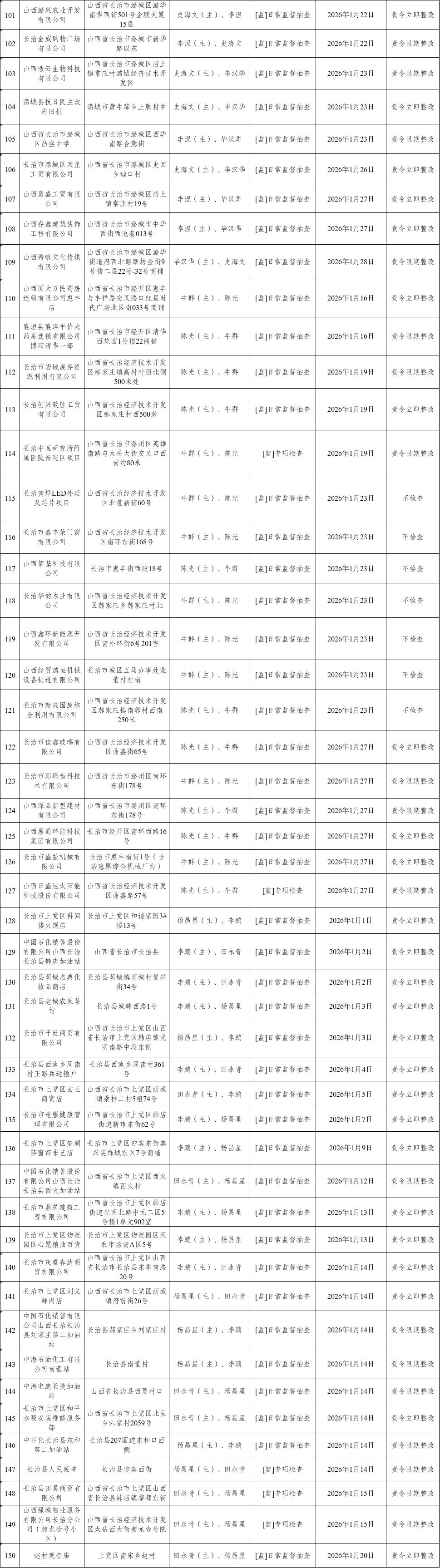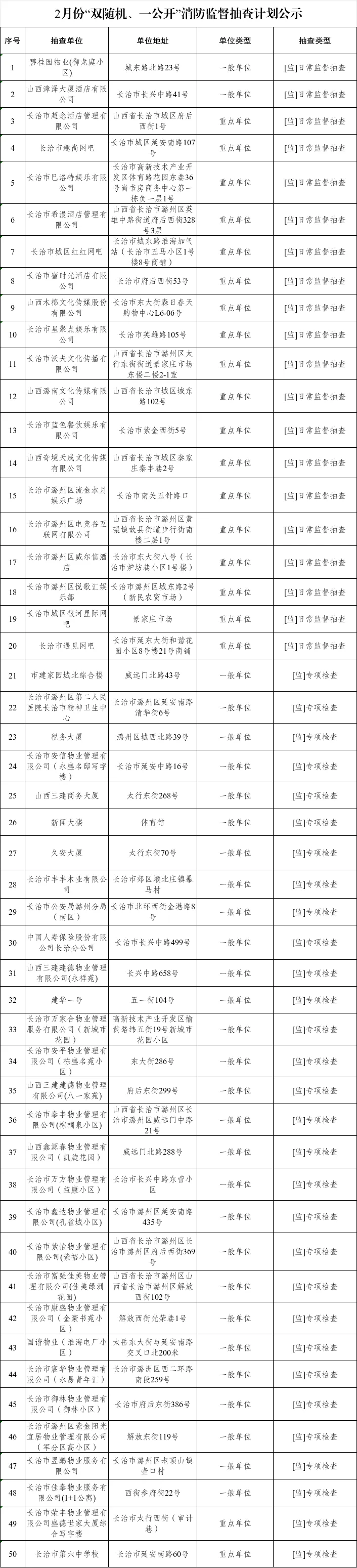 为确保火灾形势持续平稳,全面推行“双随机、一公开”消防监督管理模式,保障公共安全,督促各单位、各场所履职尽责,根据年度抽查计划和进度,长治市消防救援支队通过“双随机、一公开”系统随机生成了2026年2月份抽查单位名单,现将抽查计划公示如下: