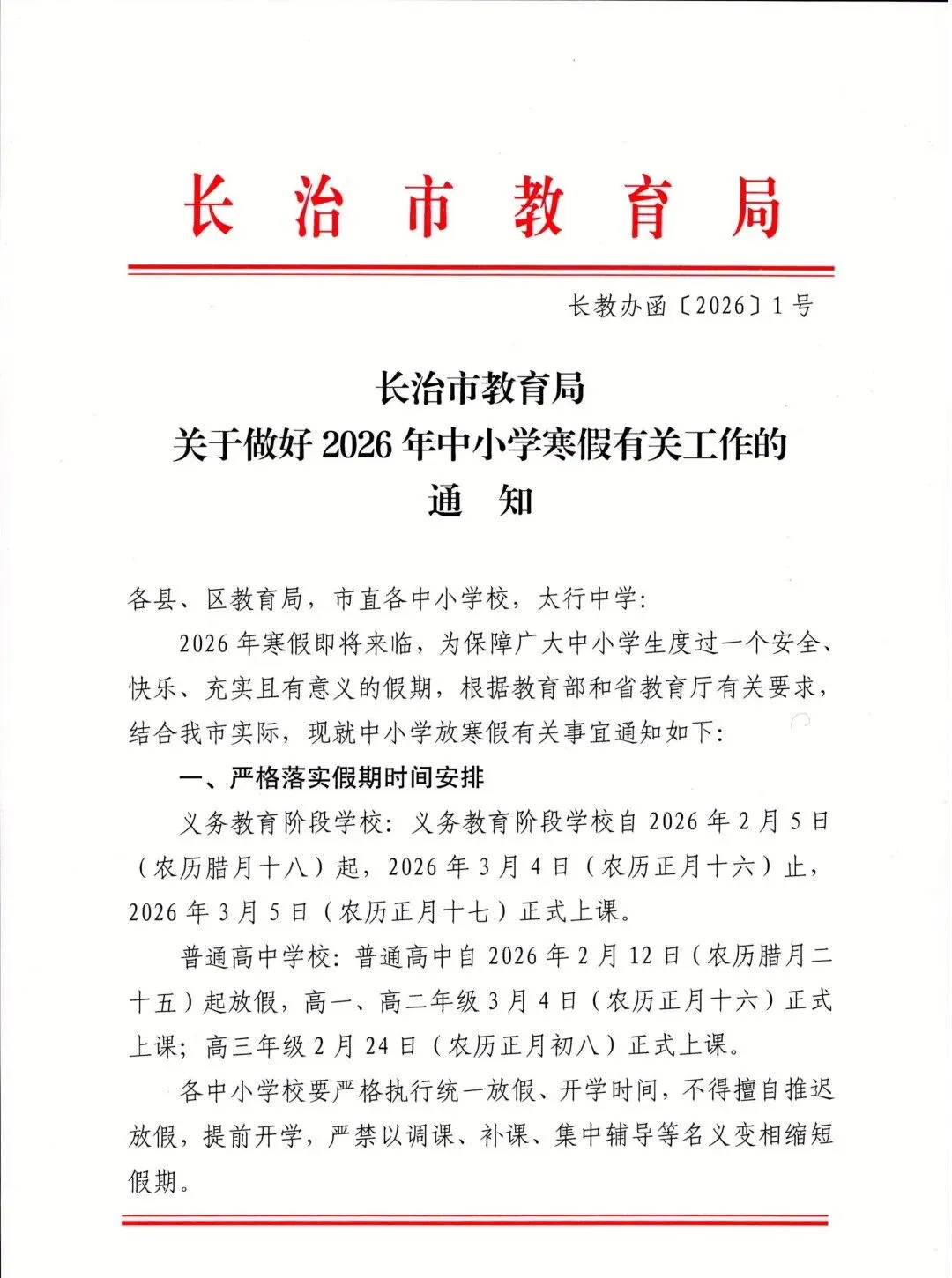 普通高中学校:普通高中自2026年2月12日(农历腊月二十五)起放假,高一、高二年级3月4日(农历正月十六)正式上课;高三年级2月24日(农历正月初八)正式上课。中等职业学校、特殊教育学校、幼儿园放寒假时间可参照本通知执行。