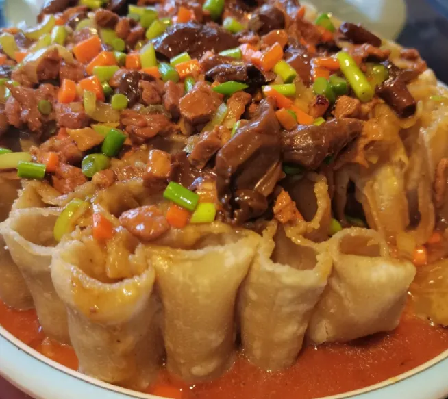 【莜面栲栳栳】这菜看着像蜂窝,其实全是功夫。开水和面,得趁热揉,手劲要大。揪一小块面团,在光溜溜的石板上用手掌一推,卷成个卷儿,立在笼屉里。大火蒸熟,出锅时热气腾腾。蘸料是灵魂,通常是羊肉臊子或者酸醋汁,夹一个在汤里滚一圈,入口软糯又不粘牙,越嚼越香。
