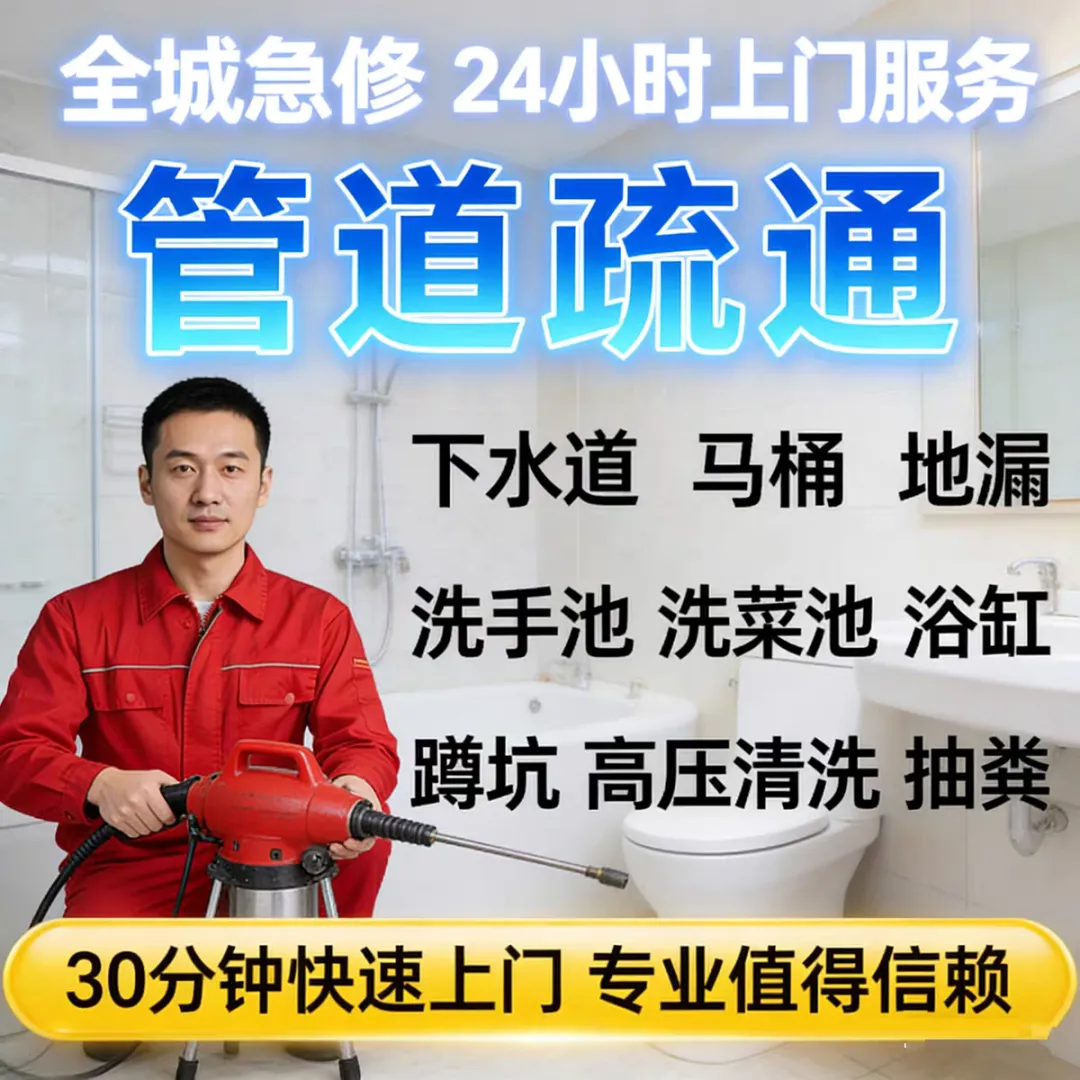 附近专业疏通下水道、管道清洗、马桶疏通、地漏疏通、化粪池清理、高压清洗、水管维修安装等服务 | 10分钟上门 | 30元起 | 不通不收费我们提供24小时同城上门疏通服务,包括下水道疏通、管道清洗、马桶疏通等。师傅经验丰富、上门迅速、价格透明,服务范围涵盖:疏通地漏、抽化粪池、维修水管、安装下水管道、高压清洗等。10分钟极速上门,30元起实惠服务,全天候响应紧急堵塞问题。