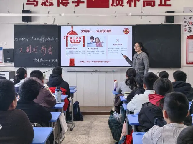 学校面向全体学生发出“文明守公德平安迎新春”倡议书,倡导同学们争做“禁放烟花”践行者,远离易燃易爆危险品;争做“文明过节”传播者,以写春联、线上拜年等“无烟火”方式传递年味;争做“安全责任”监督者,提醒家人遵守禁放规定,共同守护蓝天白云与平安校园。