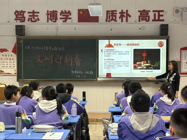 2026年新春佳节将至,为培育和践行社会主义核心价值观,弘扬中华优秀传统文化,倡导遵规守纪、文明祥和的节日风尚,营造安全、文明、和谐的节日氛围,太原三十六中教育集团老军营校区近期集中开展“文明迎新春 平安度寒假”系列活动,成效显著,具体开展情况如下: