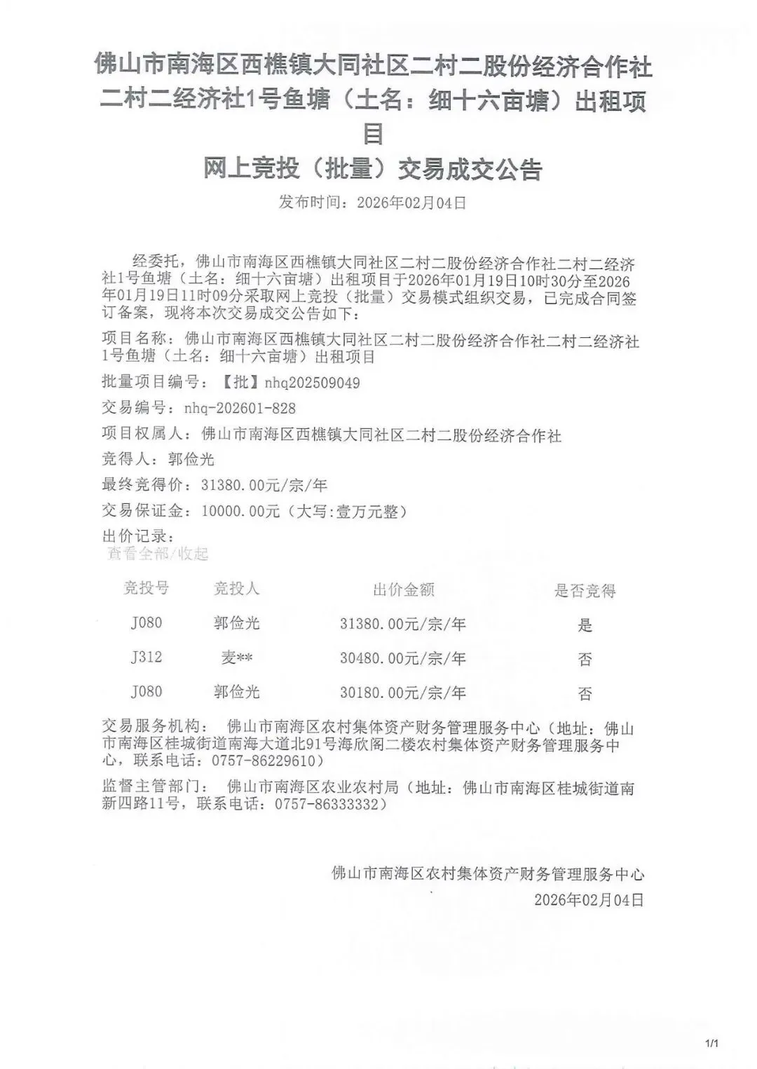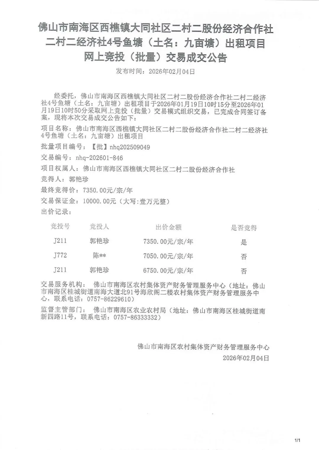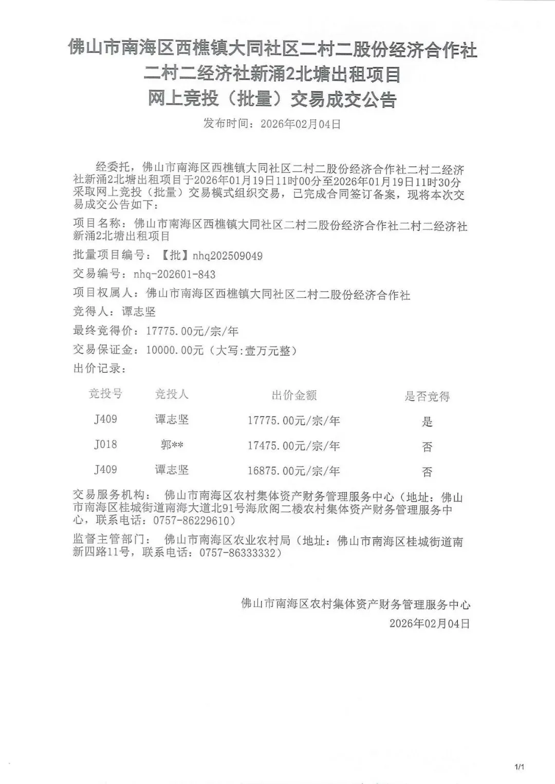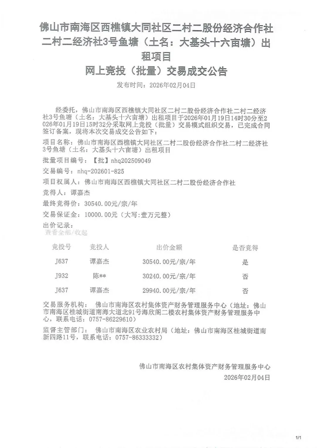 大同社区二村二经济社新塘、陈恩塘、源安塘等共29个鱼塘出租项目网上竞投(批量)交易成交公告
