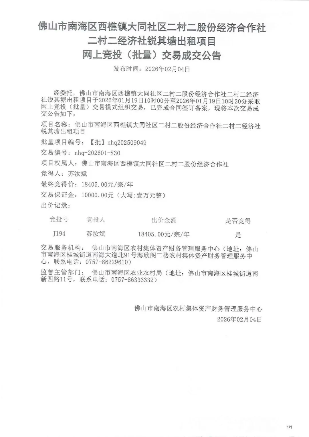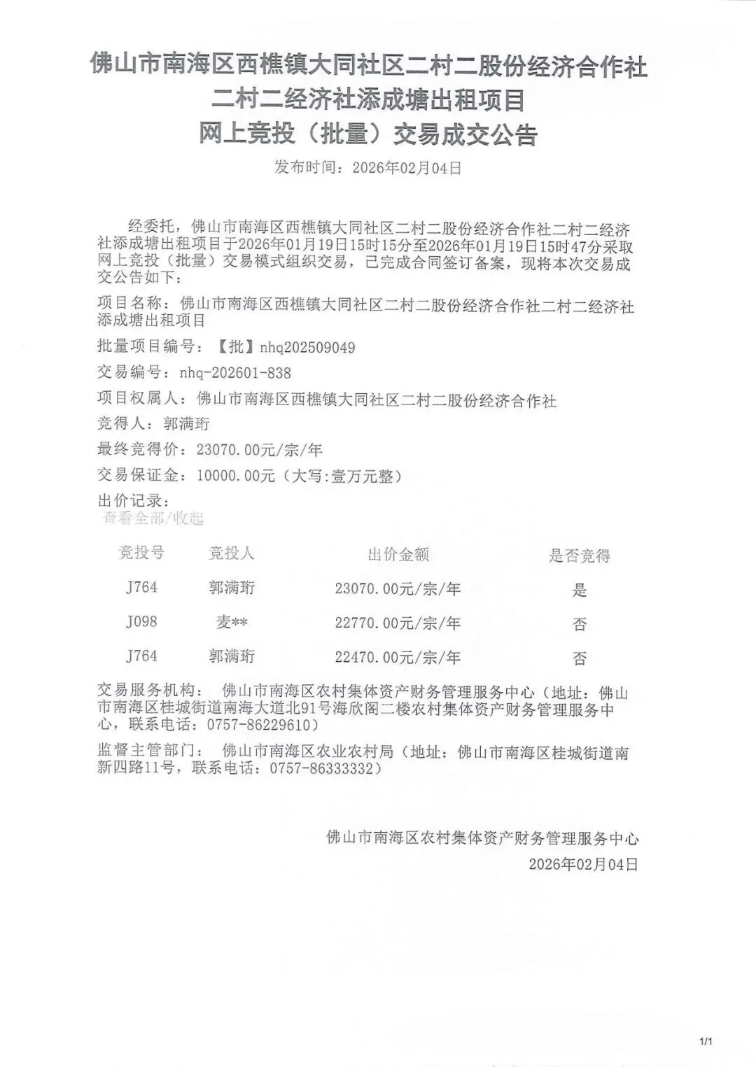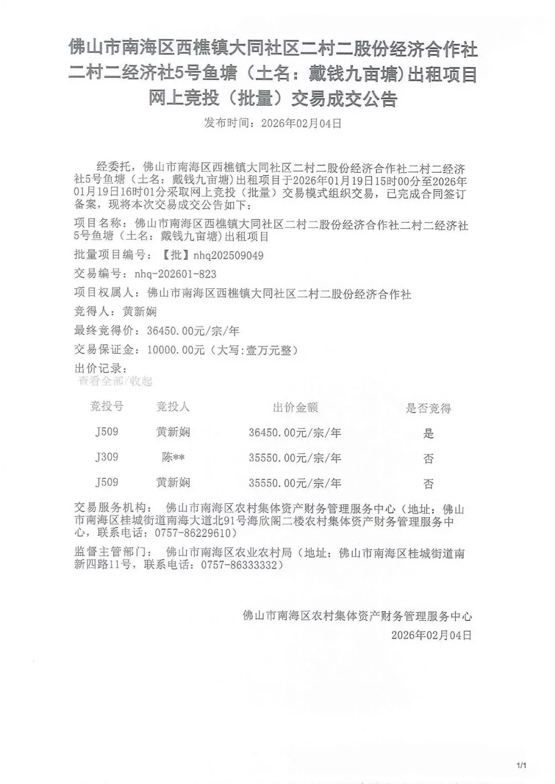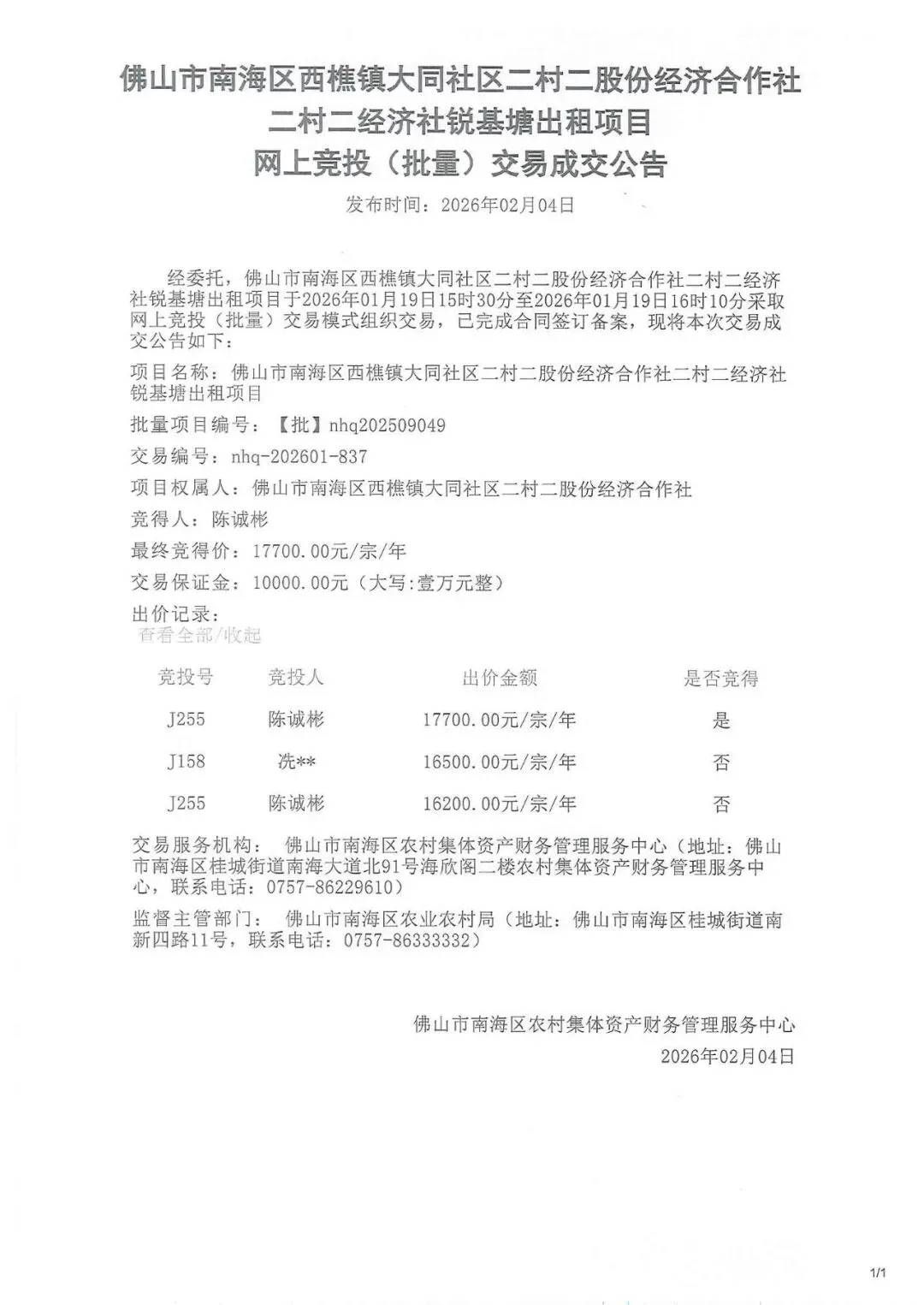 大同社区二村二经济社新塘、陈恩塘、源安塘等共29个鱼塘出租项目网上竞投(批量)交易成交公告