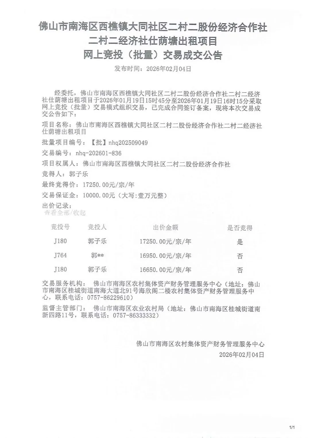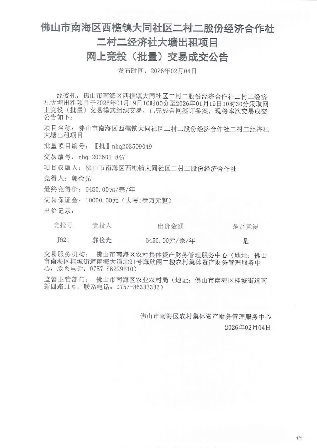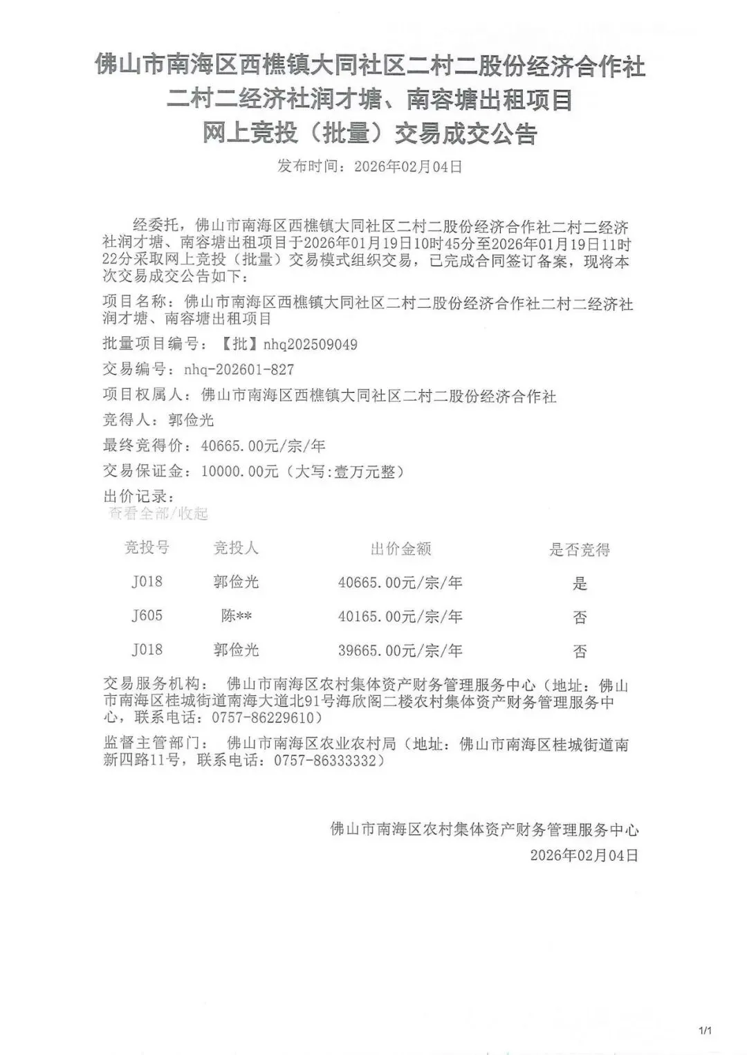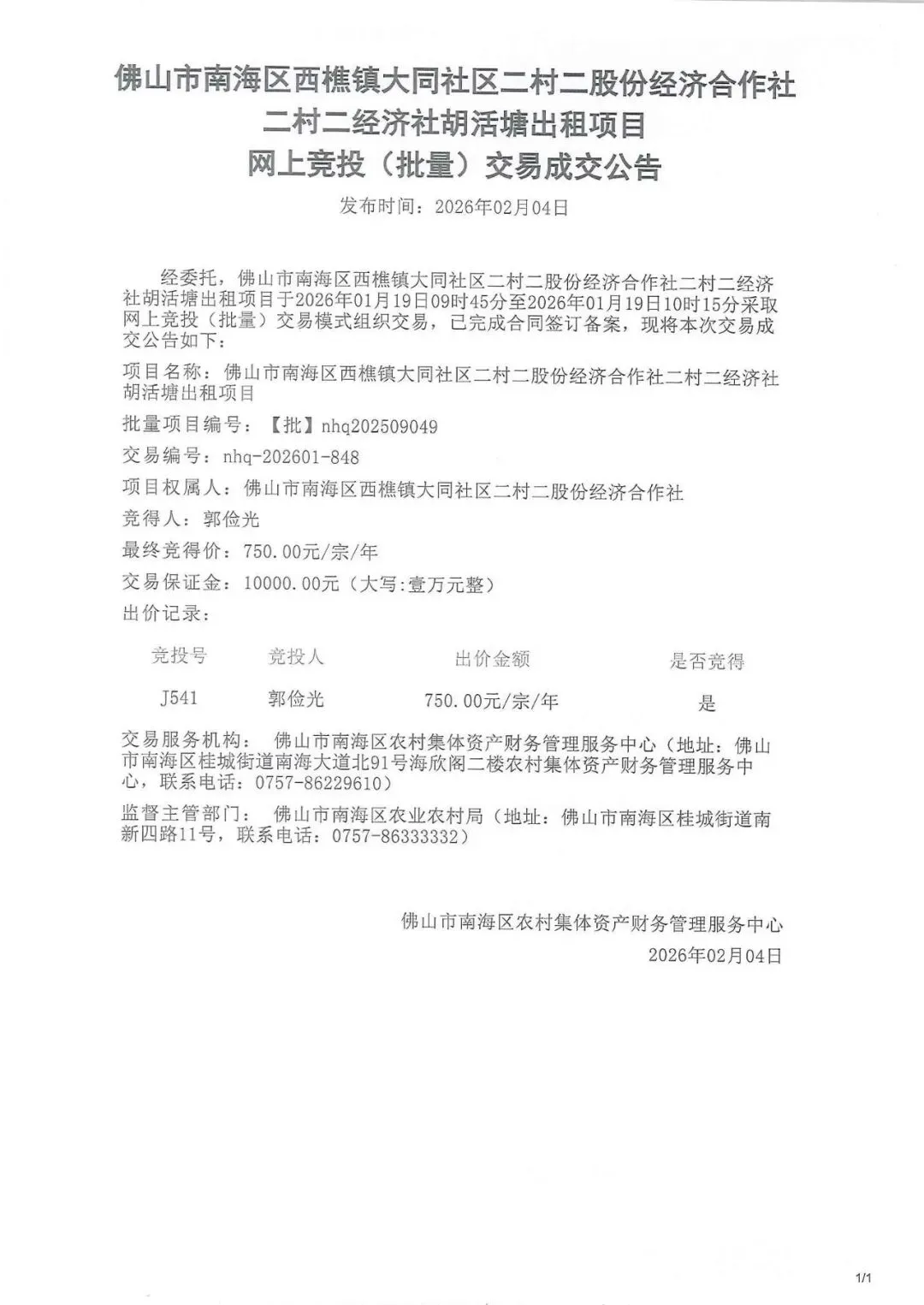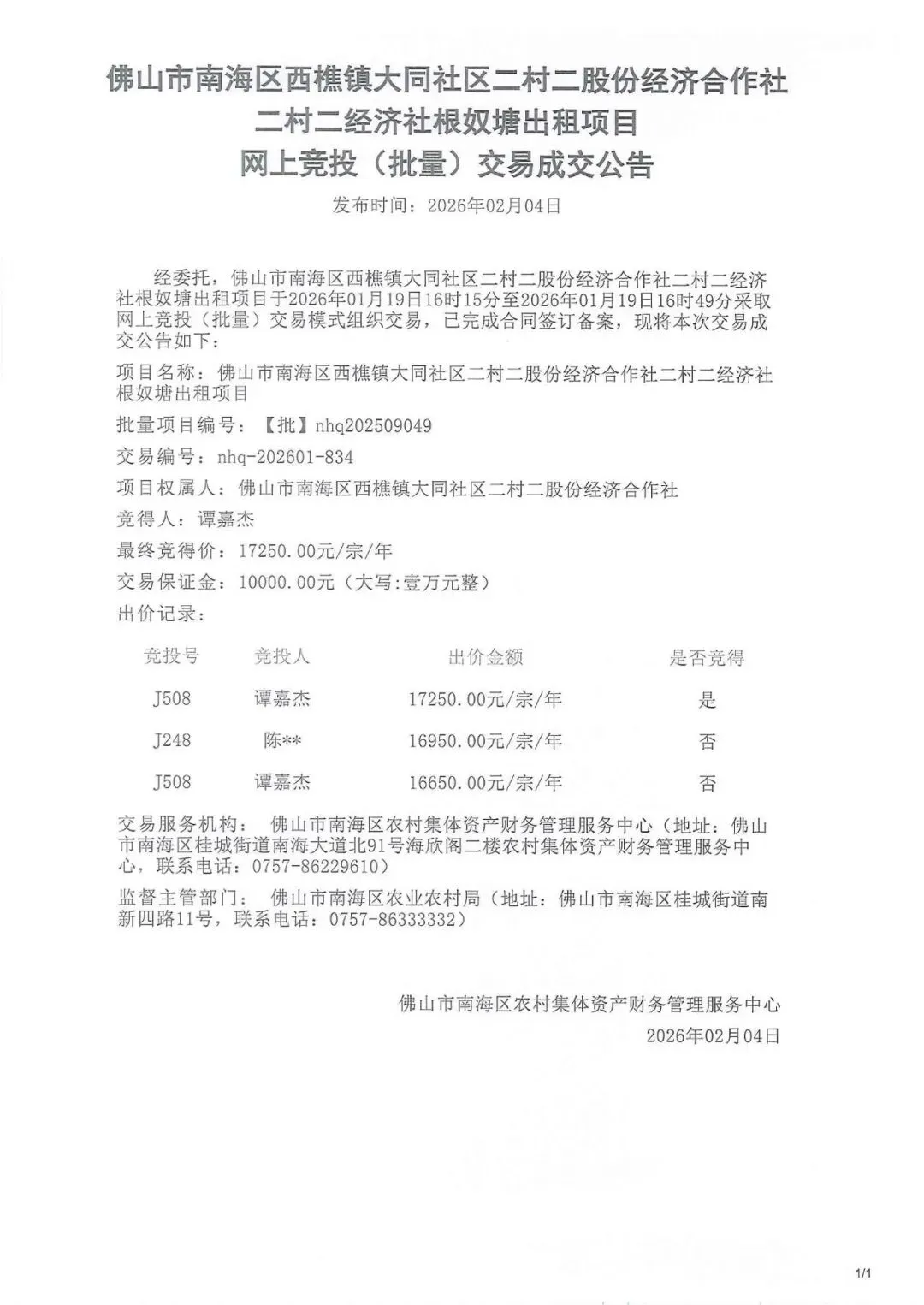 大同社区二村二经济社新塘、陈恩塘、源安塘等共29个鱼塘出租项目网上竞投(批量)交易成交公告