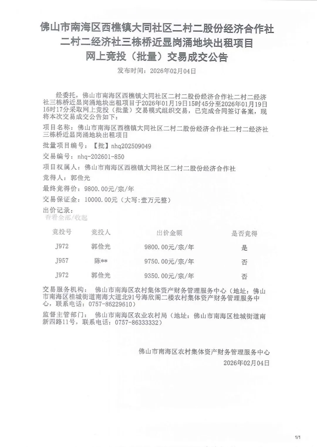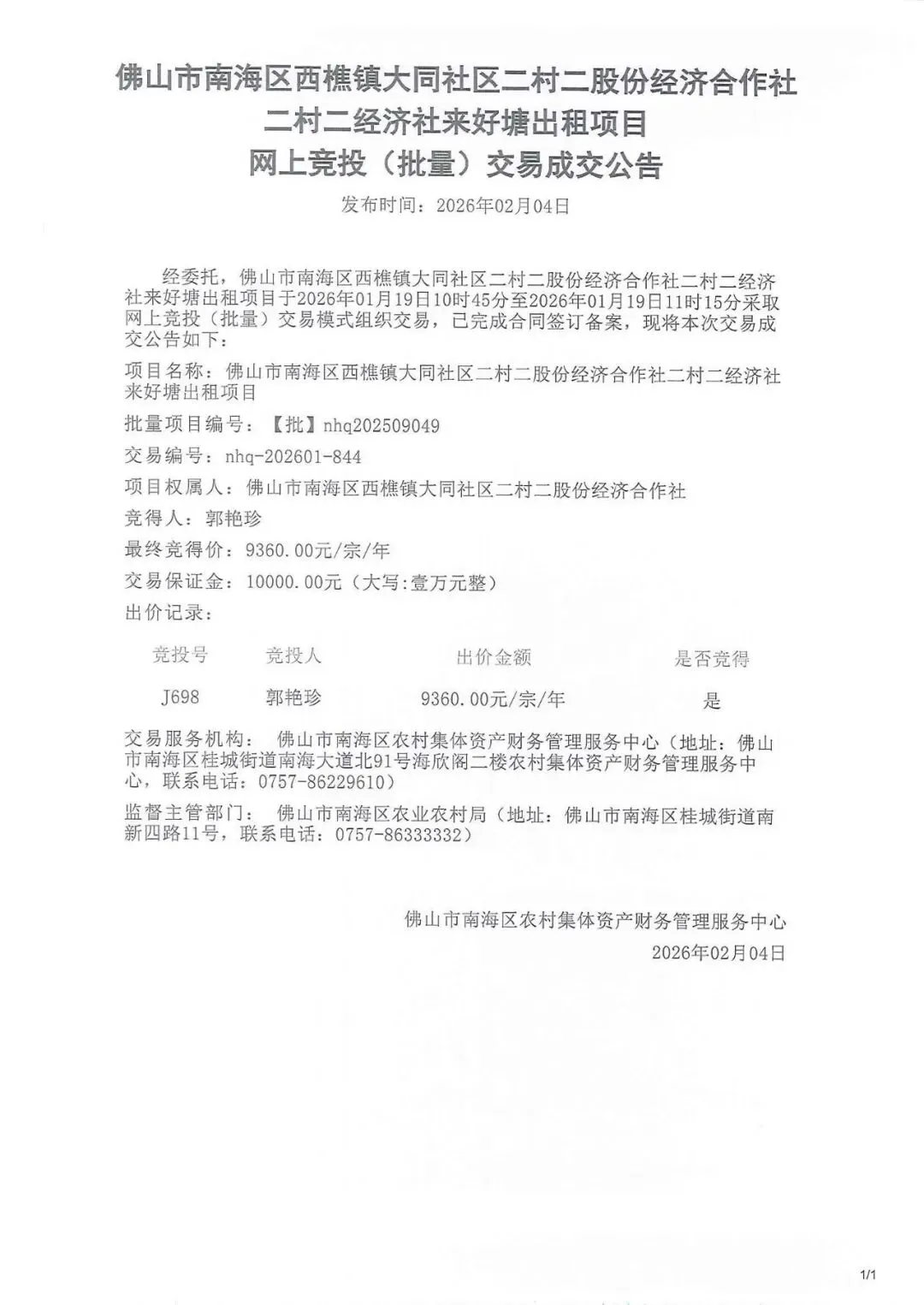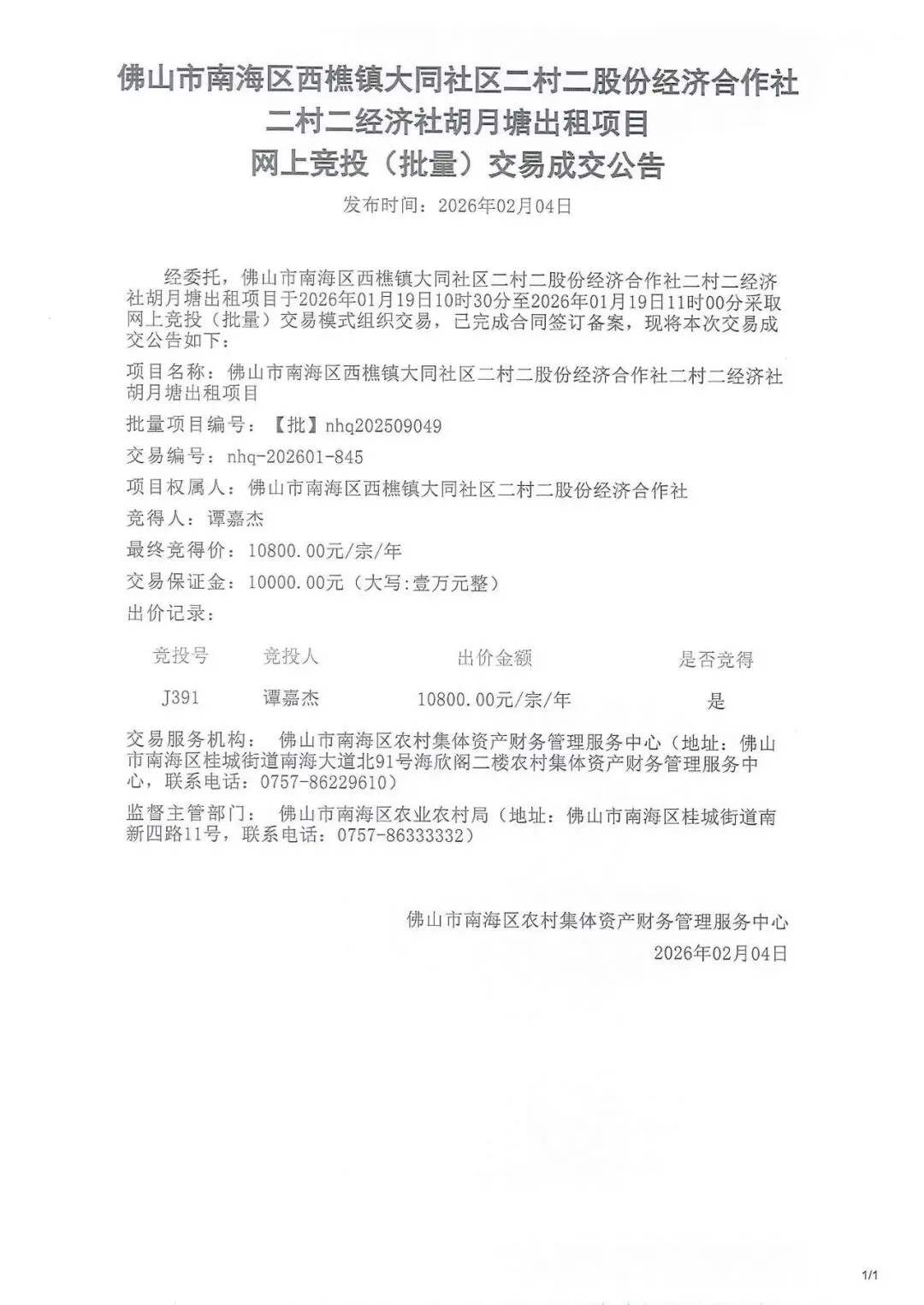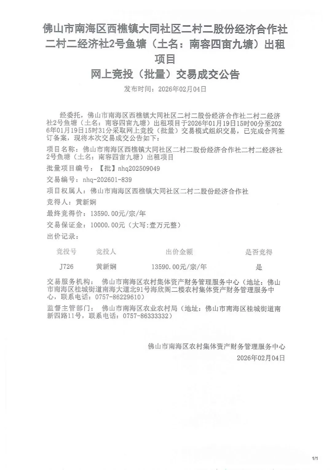 大同社区二村二经济社新塘、陈恩塘、源安塘等共29个鱼塘出租项目网上竞投(批量)交易成交公告