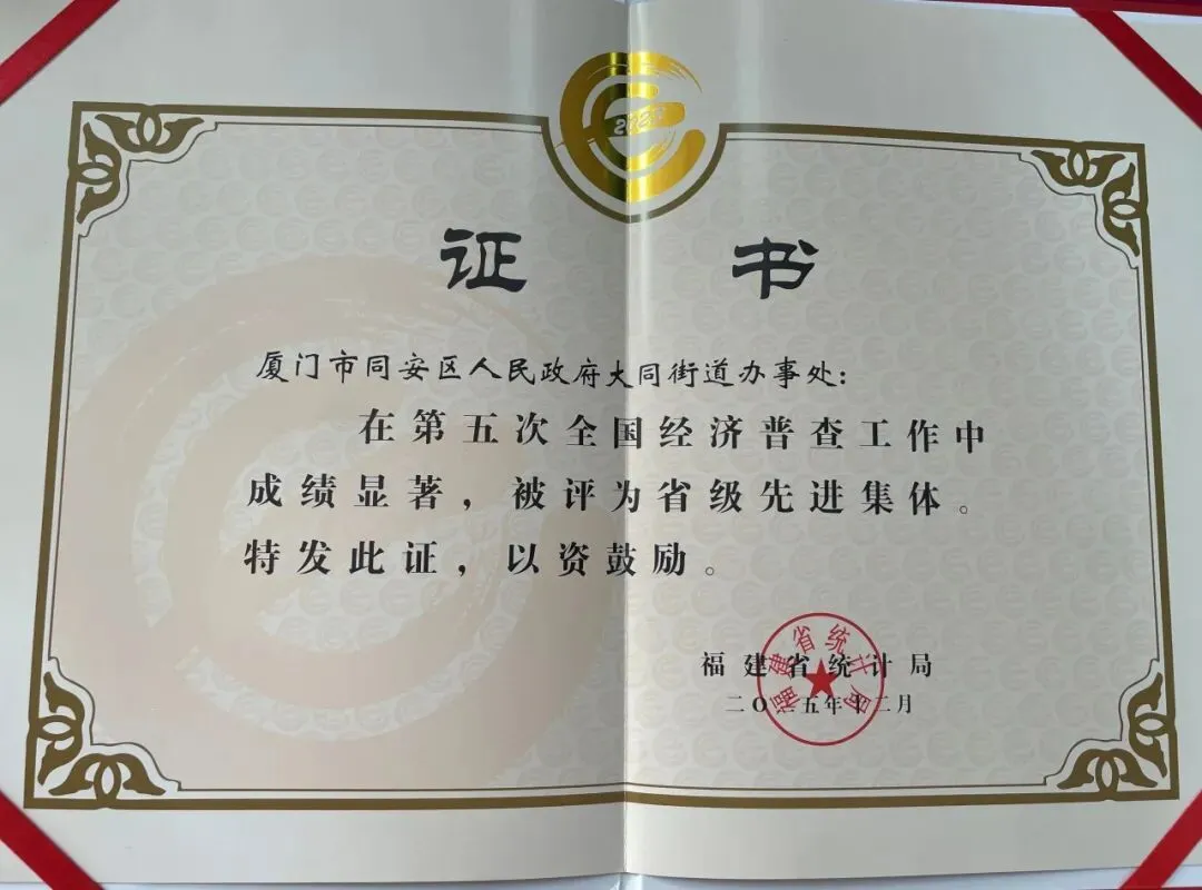 近日,福建省统计局发布《福建省统计局关于表彰福建省第五次全国经济普查先进集体和先进个人的决定》。大同街道被授予“福建省第五次全国经济普查先进集体”荣誉称号。