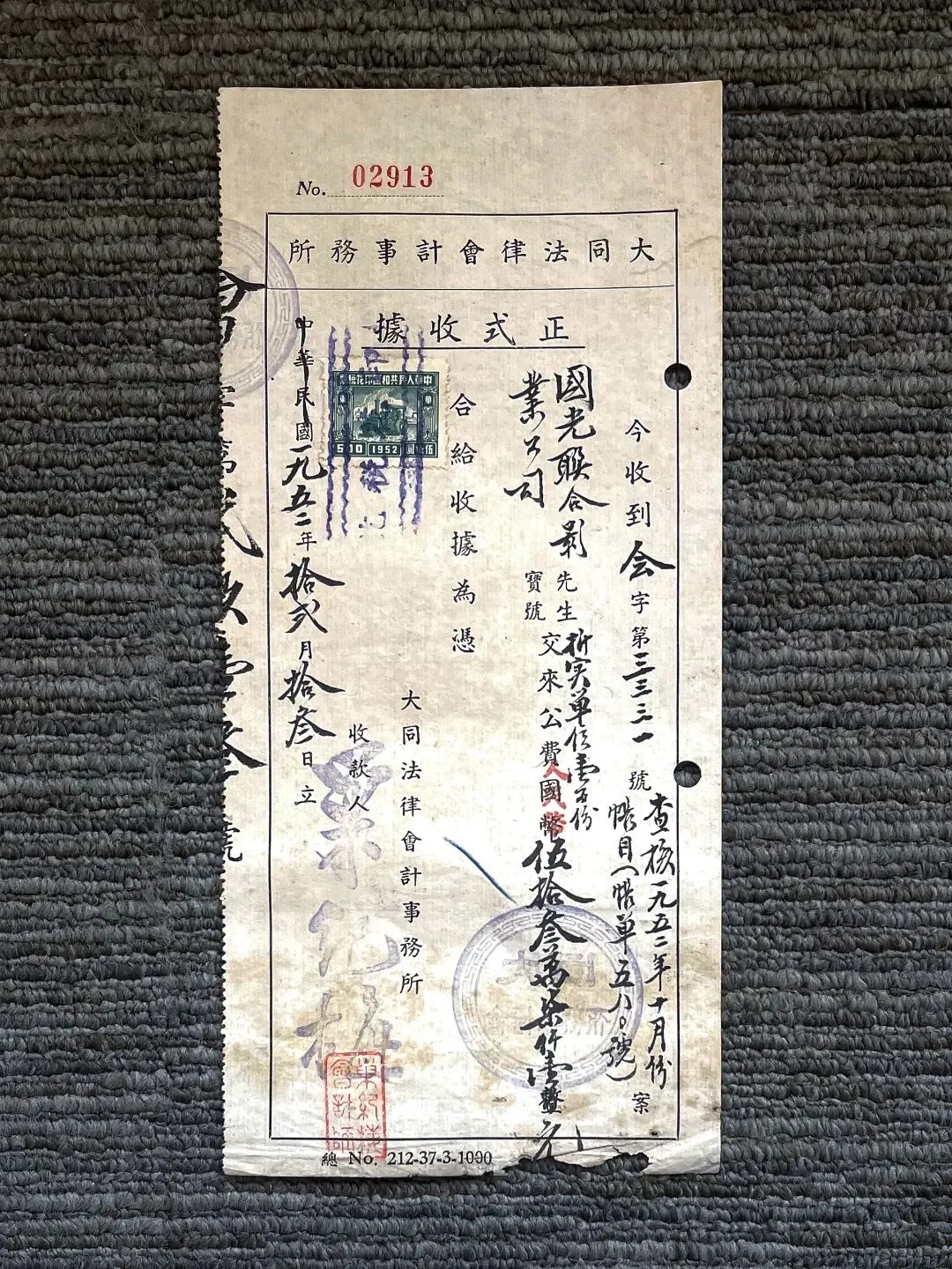 这是一张1952年12月13日开具的正式收据,开具单位为大同法律会计事务所,是一家兼具法律与会计服务的机构,在民国时期以及建国初期(公私合营前),这类私营事务所通常承担着企业查账、公证、法律咨询等业务。
