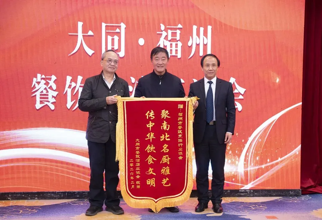 在是日的活动中,双方协会率先举行了战略合作签约仪式。此次签约,标志着两地餐饮行业正式迈入资源共享、优势互补、协同创新的新阶段,为“有福之州”与“古都大同”的美食文化深度交流搭建了重要平台,为共同擘画未来提供了良好契机。在当日举行的签约仪式上,大同市餐饮酒店协会还向福州市餐饮烹饪行业协会赠送了写有“聚南北名厨雅艺,传中华饮食文明”的锦旗。