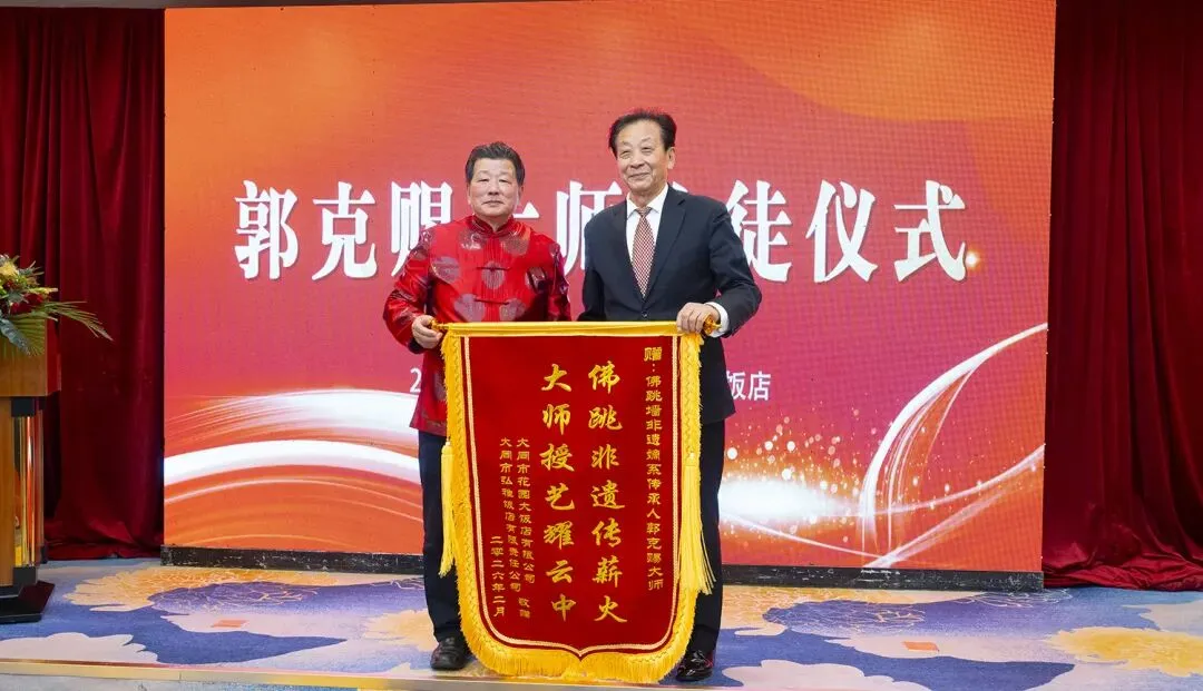 2月3日下午,花园大饭店三楼会议室掌声雷动,气氛热烈,一场别开生面的收徒仪式在这里隆重举行。花园大饭店总经理刘东和王明亮等6位厨师正式拜中国佛跳墙嫡系第三代传人郭克赐为师,前者是文化传承弟子,后者是技艺传承弟子。一场跨越千里的美食牵手与文化对话精彩上演。
